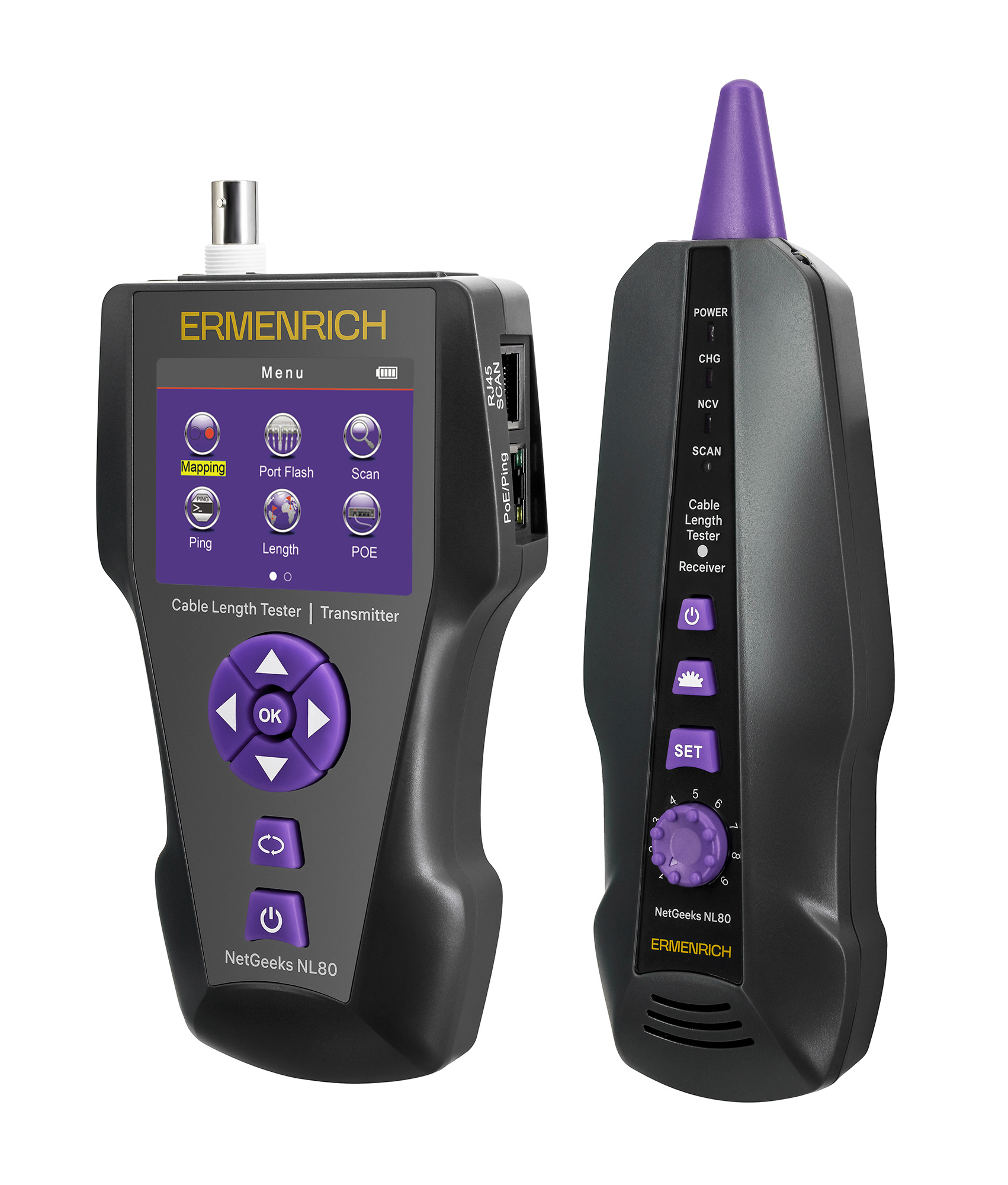Tester dĺžky káblov Ermenrich NetGeeks NL80 dokáže merať káble dlhé až 1 000 metrov a má ďalšie funkcie. Dokáže testovať prerušené obvody a skraty v kábloch, ako aj rozdelené, skrížené a obrátený dvojlinky. Dokáže tiež merať vzdialenosť k prerušeným obvodom a skratom. Ermenrich NetGeeks NL80 okrem iného dokáže sledovať káble, detekovať kábel pripojený k smerovaču alebo prepínaču, vykonávať testy PoE a PING a ukladať výsledky na pamäťovú kartu.