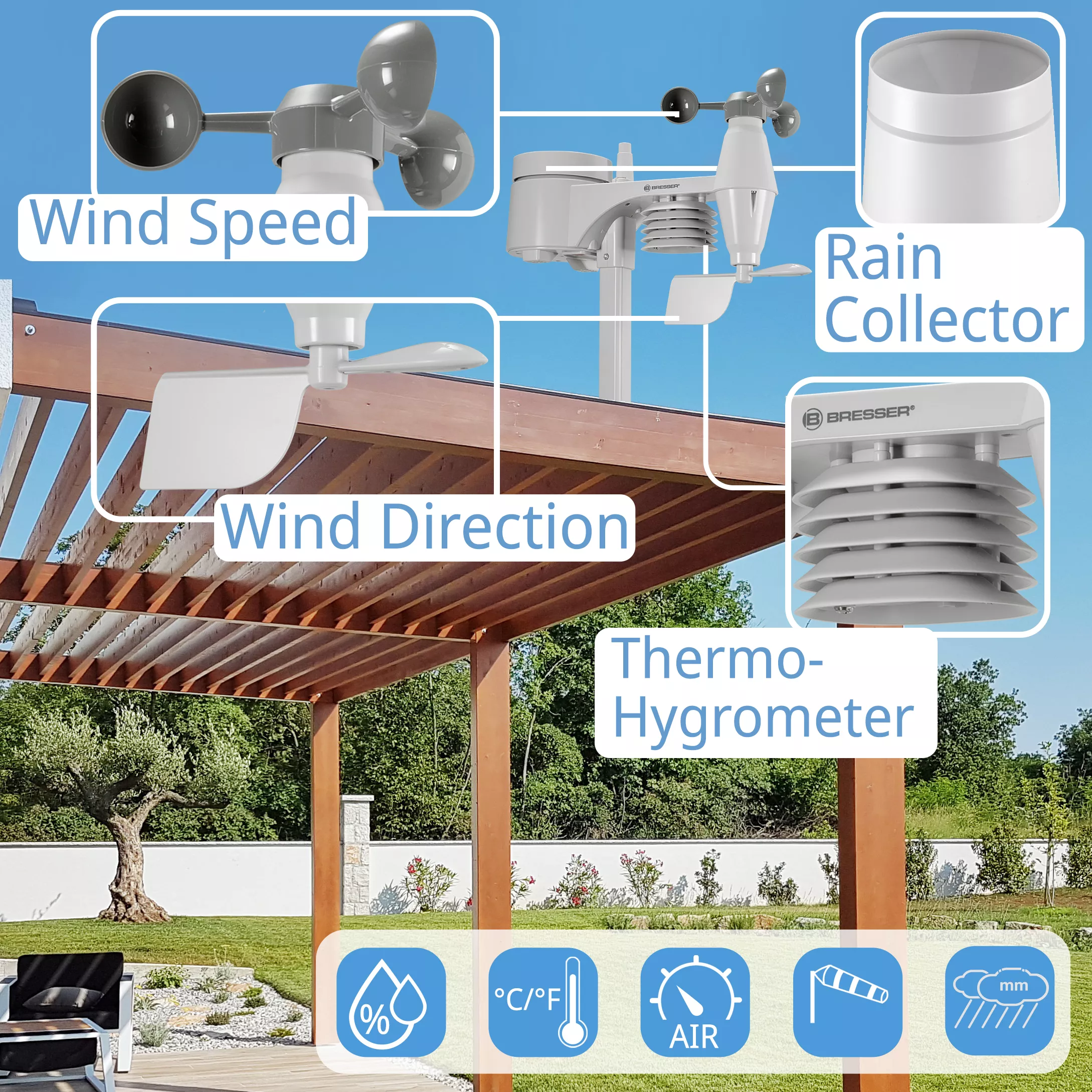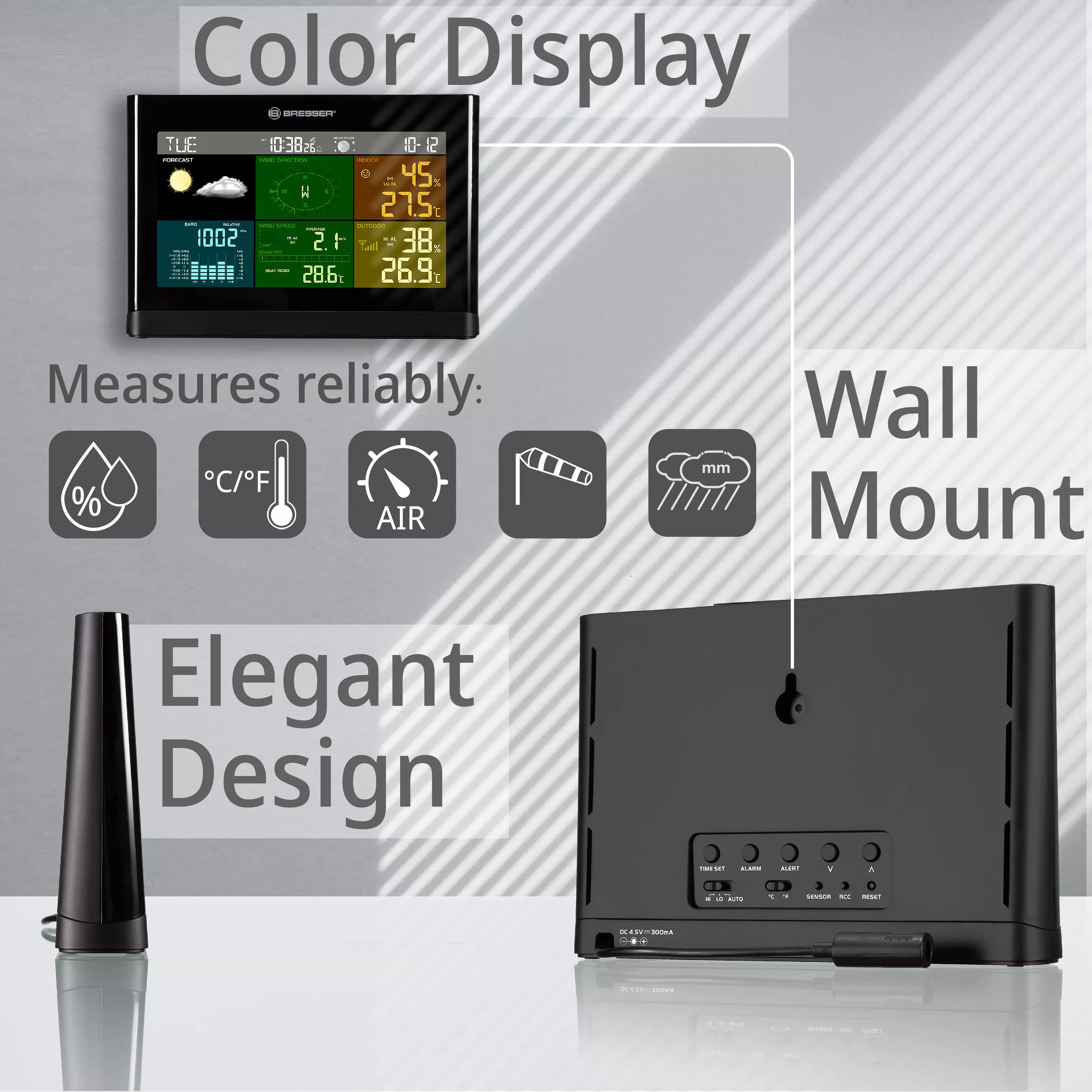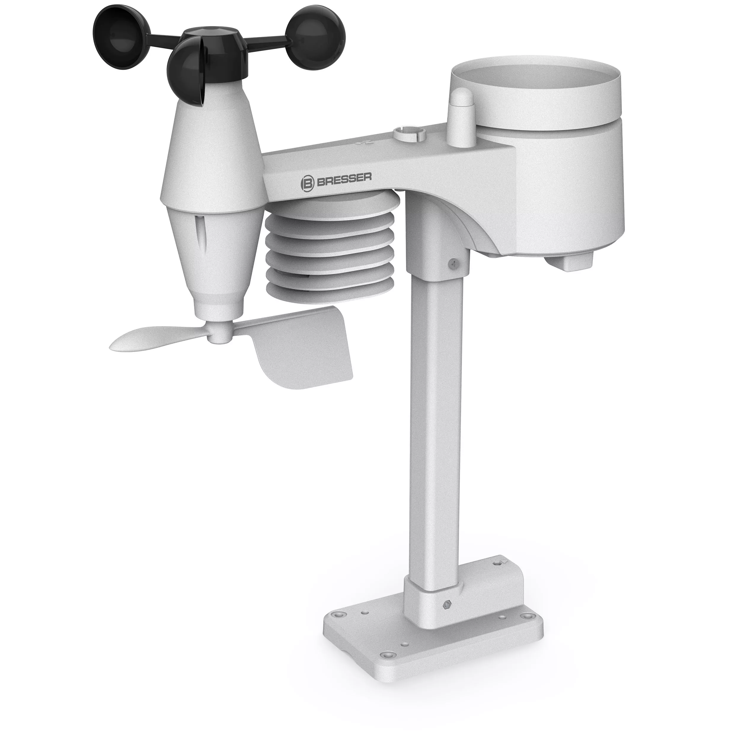The new BRESSER Weather Station 5-in-1 combines in a unique way a compact design with an extensive information service. The very compact and multifunctional outdoor sensor requires only little space and thus can be placed almost anywhere. A pipe clamp and screws for the attachment at poles (pipe diameter of about 25-33 mm) as well as a stand are already included!