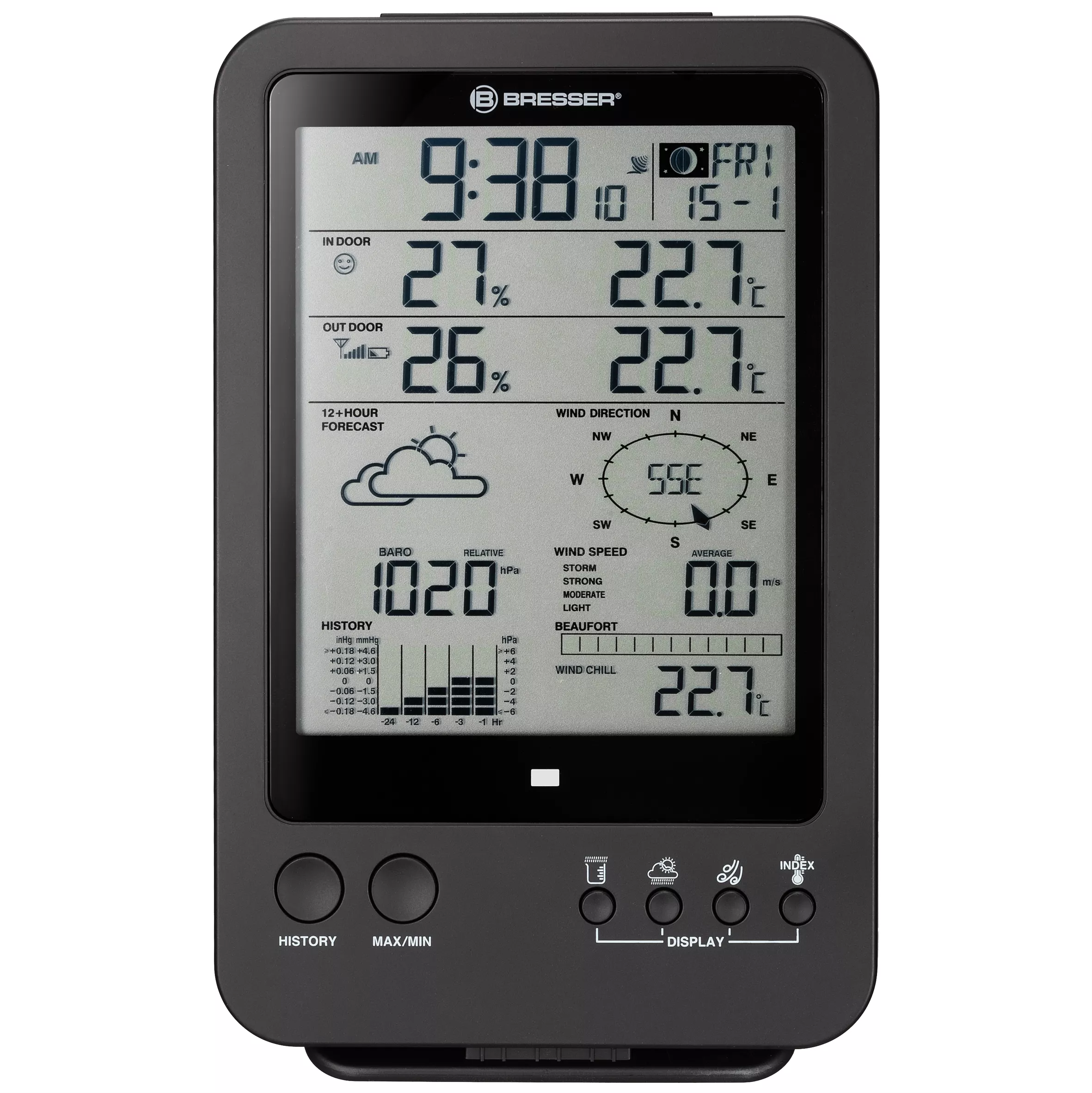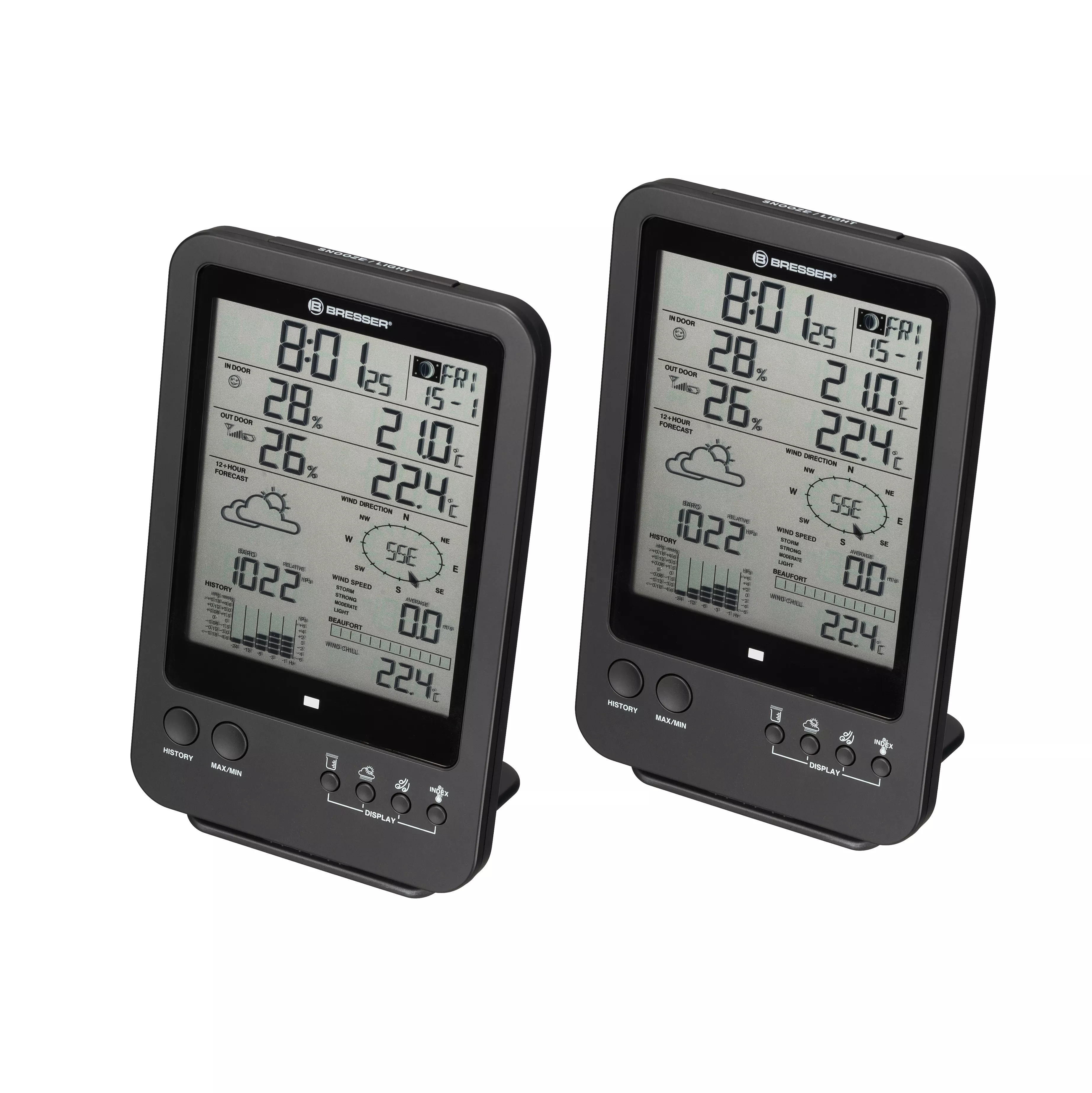 Meteorologická stanica 5 v 1 značky BRESSER s prídavnou základňovou stanicou vám umožňuje zobrazovať údaje o miestnom počasí v dvoch rôznych miestnostiach. Po namontovaní kompaktného vonkajšieho multisenzora sa vaše údaje o vonkajšej teplote, vlhkosti, rýchlosti vetra a zrážkach budú prenášať do dvoch základných staníc v okruhu približne 150 metrov. Okrem zobrazenia vašich meraní vám základňové stanice zobrazia aj spoľahlivú miestnu predpoveď počasia na nasledujúcich 12 hodín. A aby ste mohli sledovať posledné trendy počasia, meteorologická stanica má historickú pamäť, do ktorej sa ukladajú všetky merania za posledných 24 hodín.