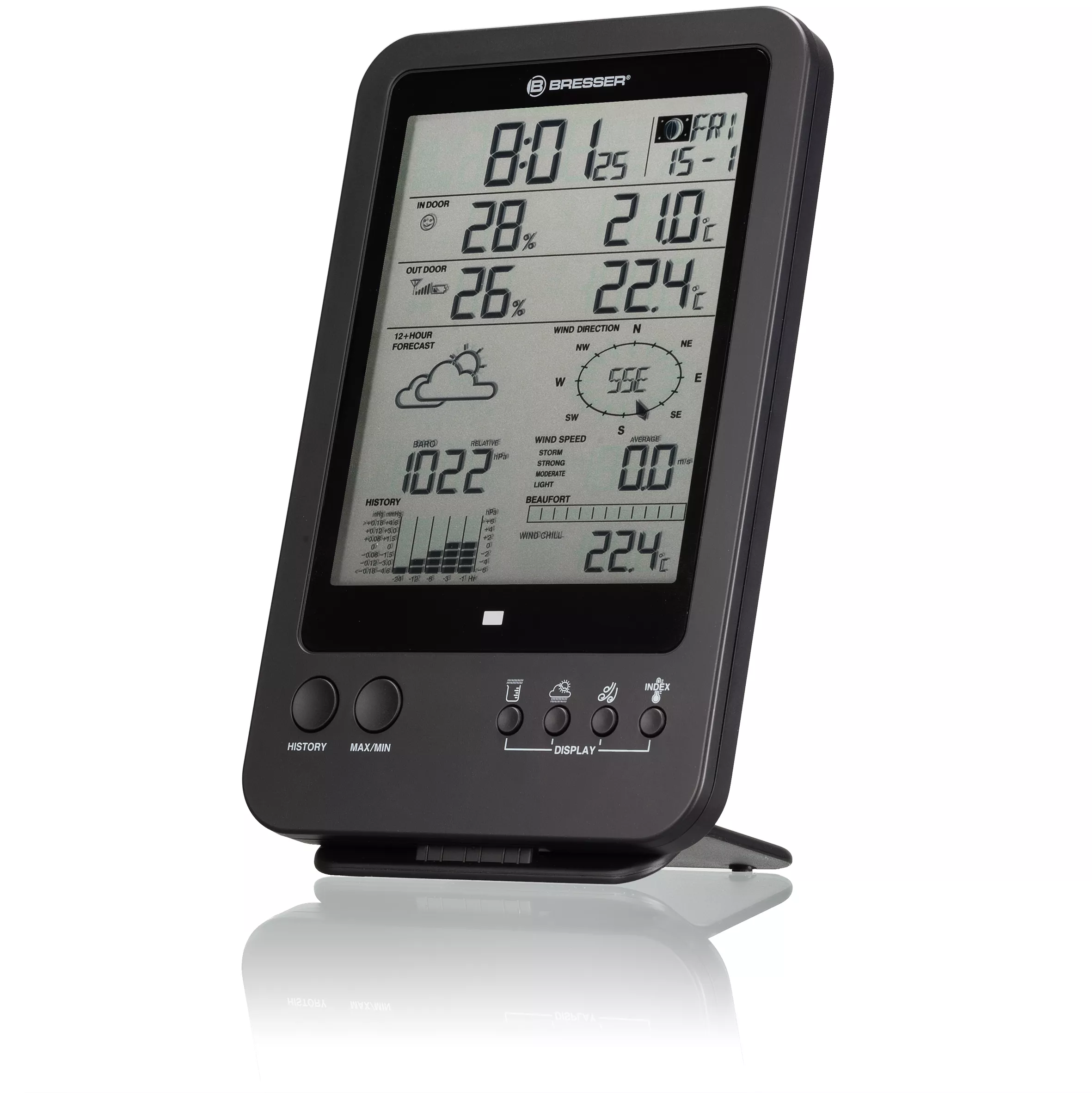 Meteorologická stanica zobrazuje aj presný stredoeurópsky čas (SEČ), dátum a deň v týždni prostredníctvom rádiového signálu DCF. Tieto údaje sa automaticky zobrazia na displeji niekoľko minút po zapnutí základňovej stanice. A ak radi pozorujete Mesiac, meteostanica zobrazuje aj aktuálnu fázu Mesiaca.