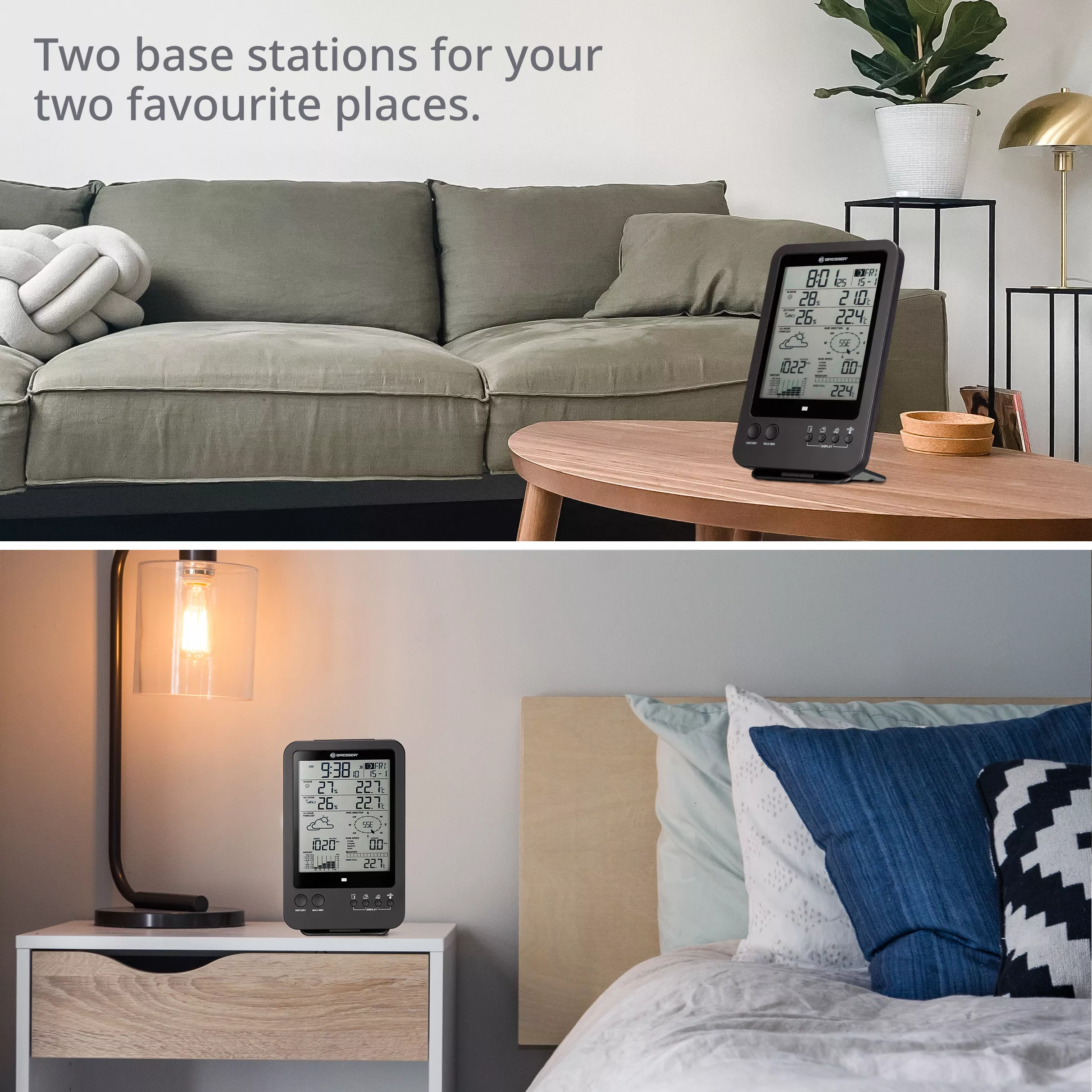 1x meranie, 2x zobrazenie: Meteorologická stanica BRESSER 5 v 1 s prídavnou základňovou stanicou umožňuje zobrazovať údaje o miestnom počasí v dvoch miestnostiach alebo domácnostiach.