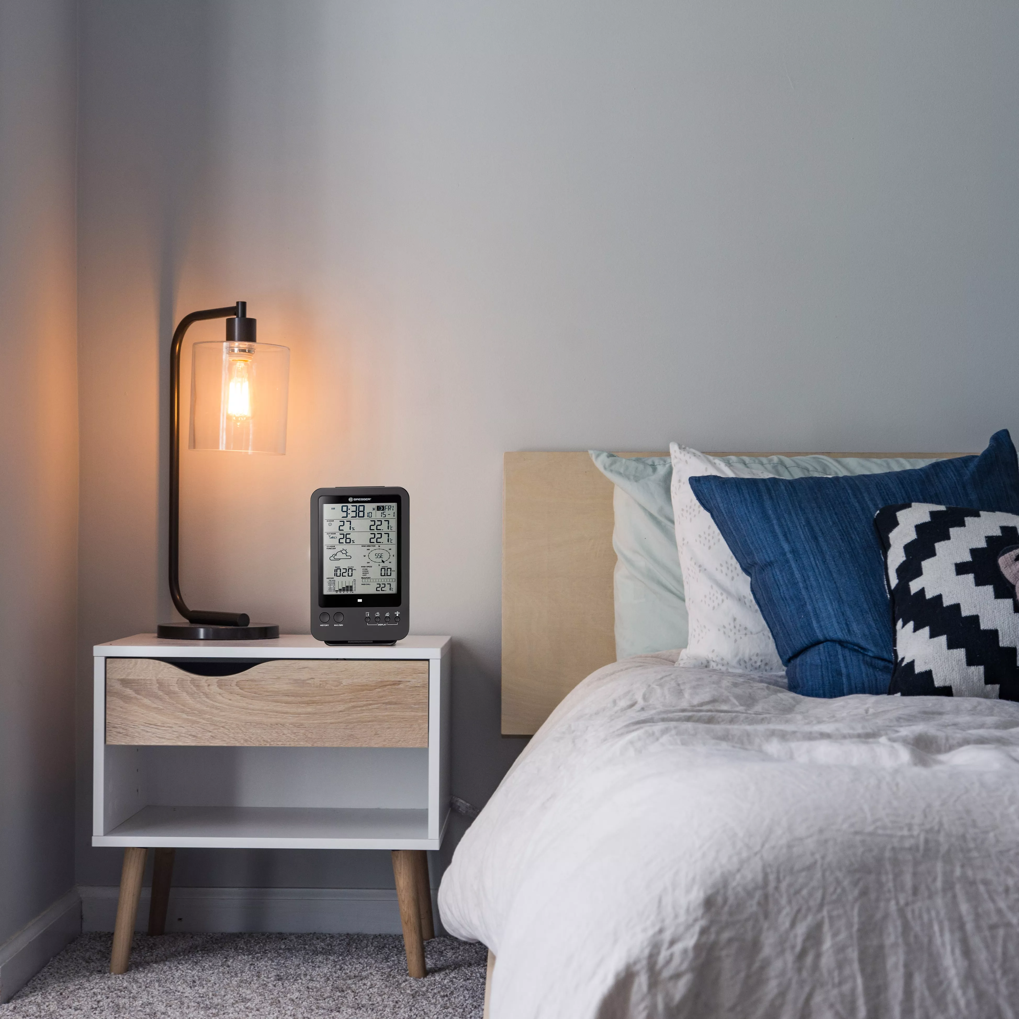 Ak chcete čo najlepšie využiť predpoveď počasia, umiestnite jednu zo základných staníc do spálne. Každá základňová stanica má šikovný dizajn, ktorý dokonale ladí so všetkými štýlmi interiéru. Majú tiež integrovaný budík, ktorý vás zaručene vytiahne z postele včas. A ak potrebujete v posteli päť minút navyše, stačí po zaznení budíka stlačiť tlačidlo snooze. V chladných dňoch vám zabudovaný budík s funkciou ľadu a mrazu poskytne dostatok času na prípravu na rannú cestu do práce. Keď teplota klesne pod -3 °C, budík sa spustí o 30 minút skôr - dostatok času na to, aby ste sa bezpečne dostali do práce alebo do školy.