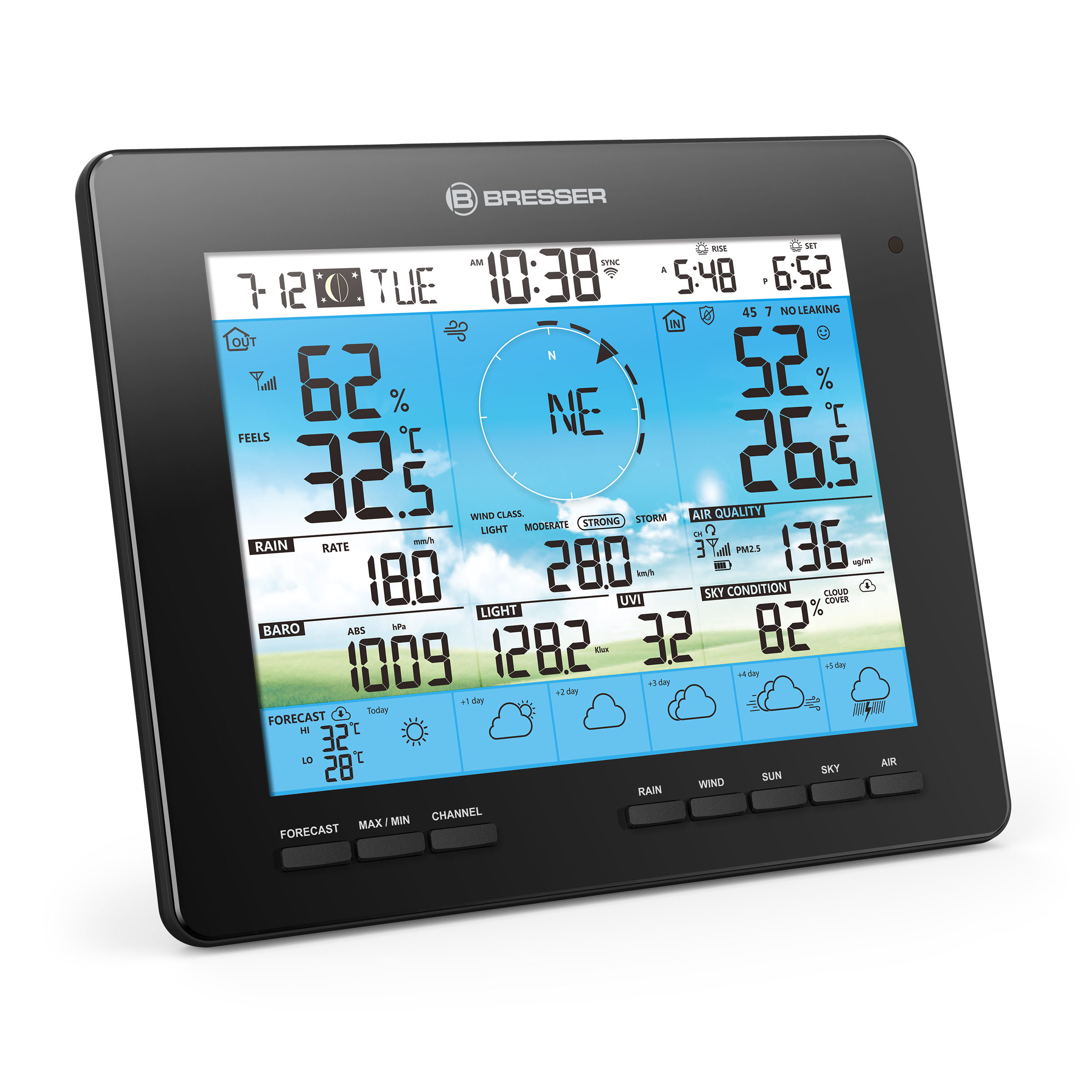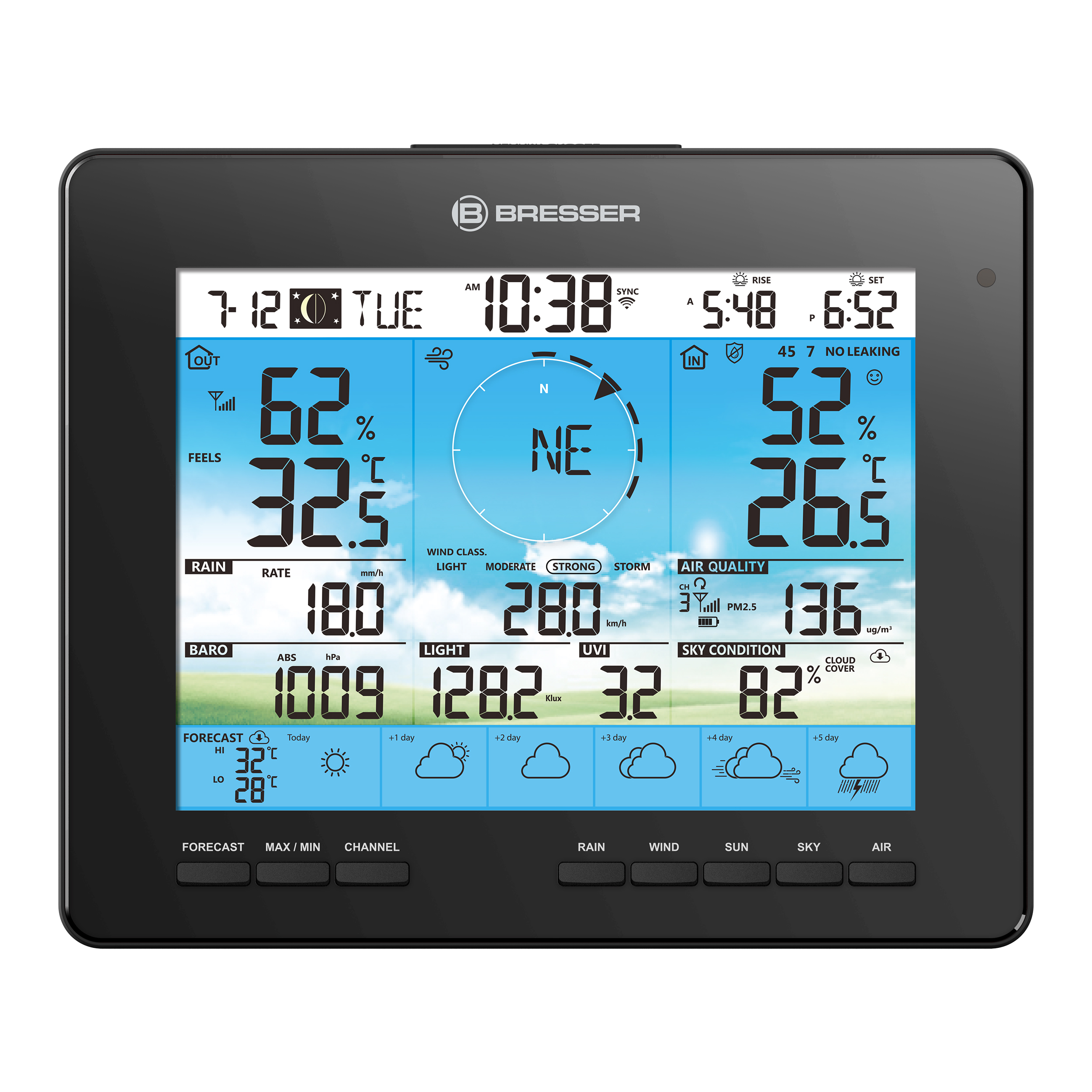 So 6-dňovou meteorologickou stanicou BRESSER 4CAST PRO WLAN 7 v 1 solar sa meteorologické prekvapenia rýchlo stratia zo scény. Nahradí ich spoľahlivá predpoveď počasia na 6 dní na štýlovom farebnom displeji. Všetky potrebné údaje sa prenášajú z platformy ProWeatherLive cez internet do solárnej meteorologickej stanice WLAN a zobrazujú sa ako grafický symbol. Skvelý doplnok pre lepší prehľad o počasí: zobrazenie miestnej viditeľnosti a oblačnosti zo servera ProWeatherLive.