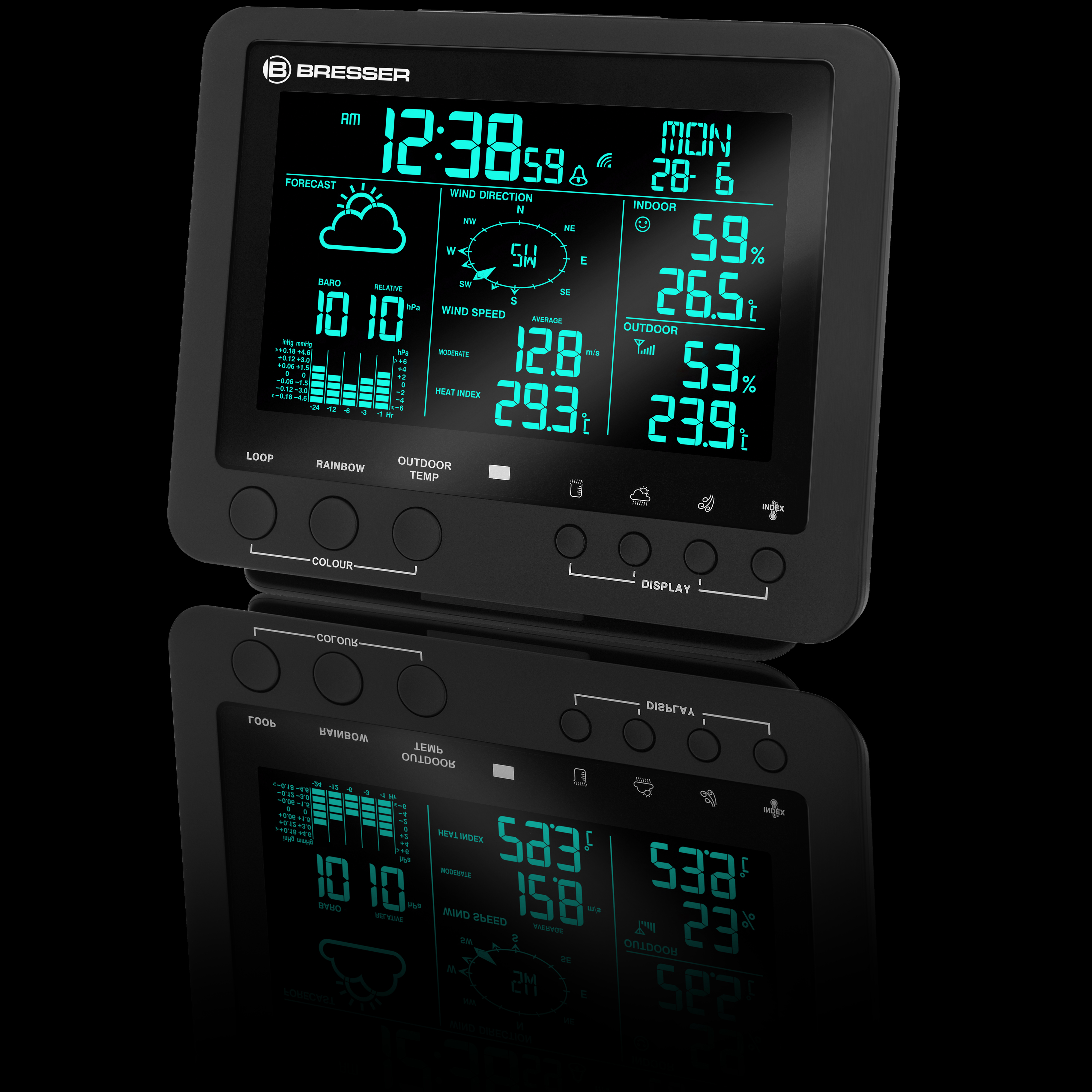 Na prehľadnom displeji základňovej stanice sa zobrazuje aj široká škála historických údajov . Umožňuje interné ukladanie a vyhodnocovanie nameraných údajov za obdobie 24 hodín. Meteostanica využíva zozbierané údaje z meraní na výpočet veľmi spoľahlivej lokálnej predpovede vývoja počasia na nasledujúcich 12 hodín, ktorá sa zobrazuje na displeji pomocou šiestich grafických symbolov. Pre maximálne a minimálne hodnoty možno individuálne naprogramovať alarm , ktorý po dosiahnutí zadanej hodnoty spustí akustický aj svetelný signál. Pri vonkajších teplotách od -3 °C je možné aktivovať aj špeciálny výstražný alarm pred mrazom/ľadom .