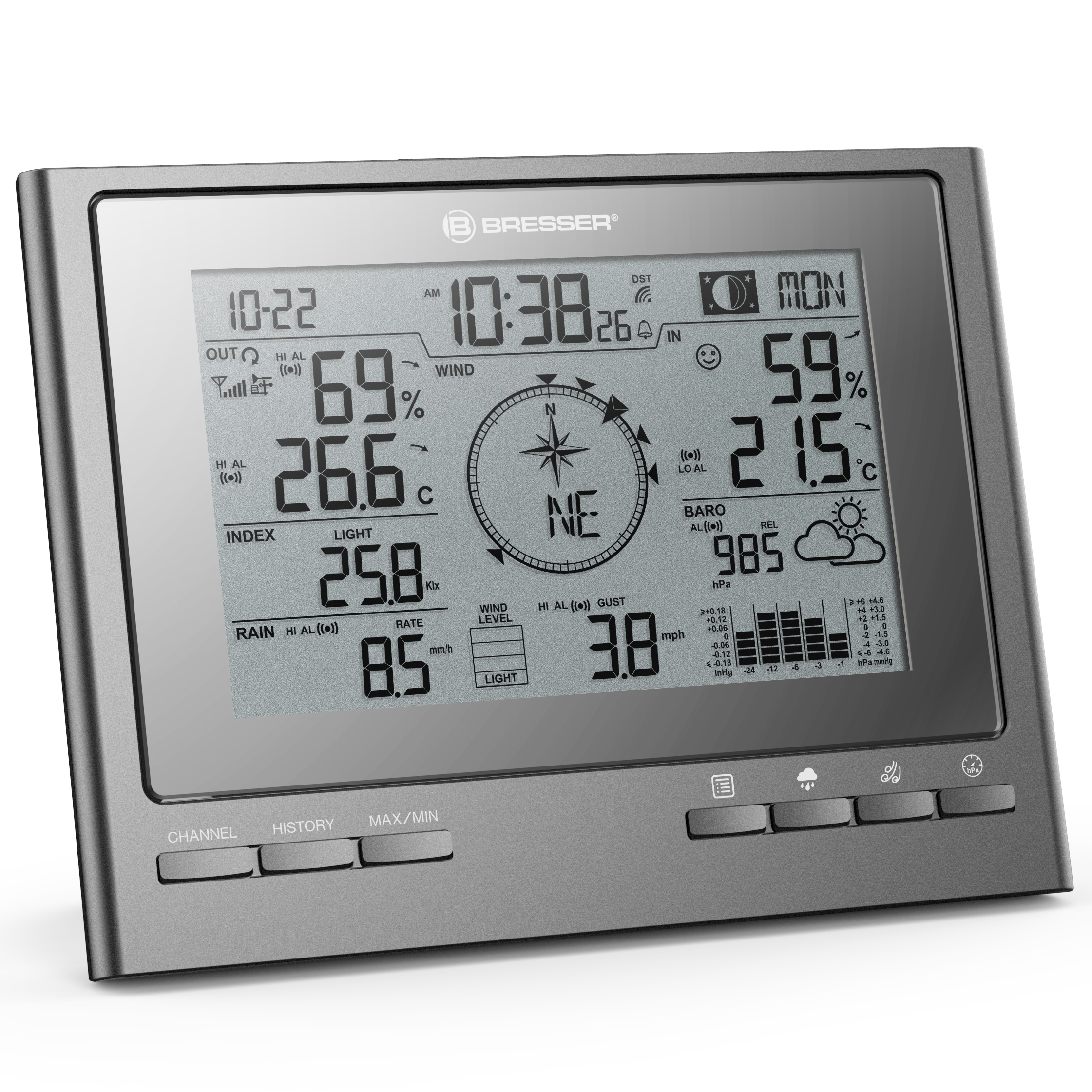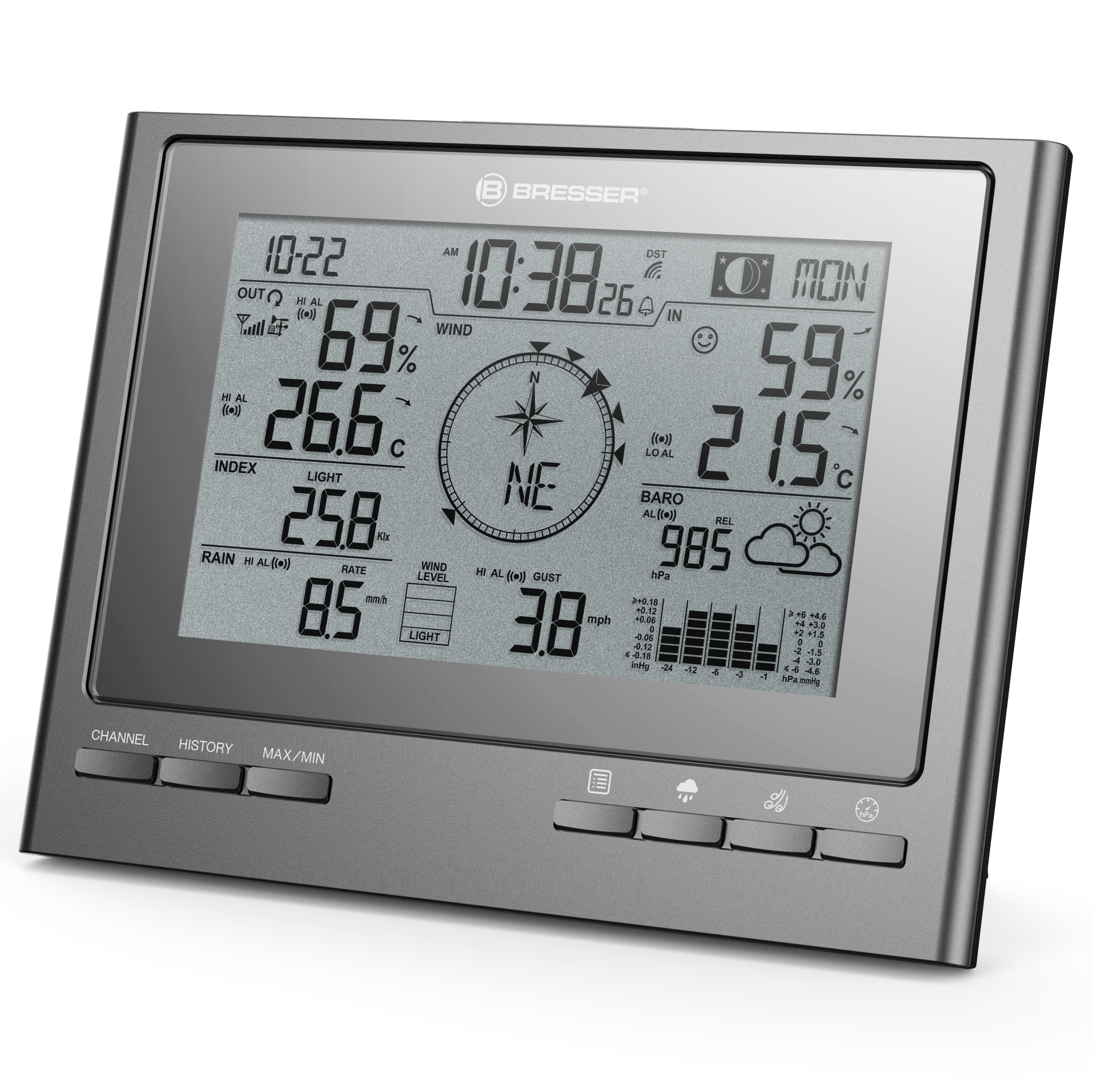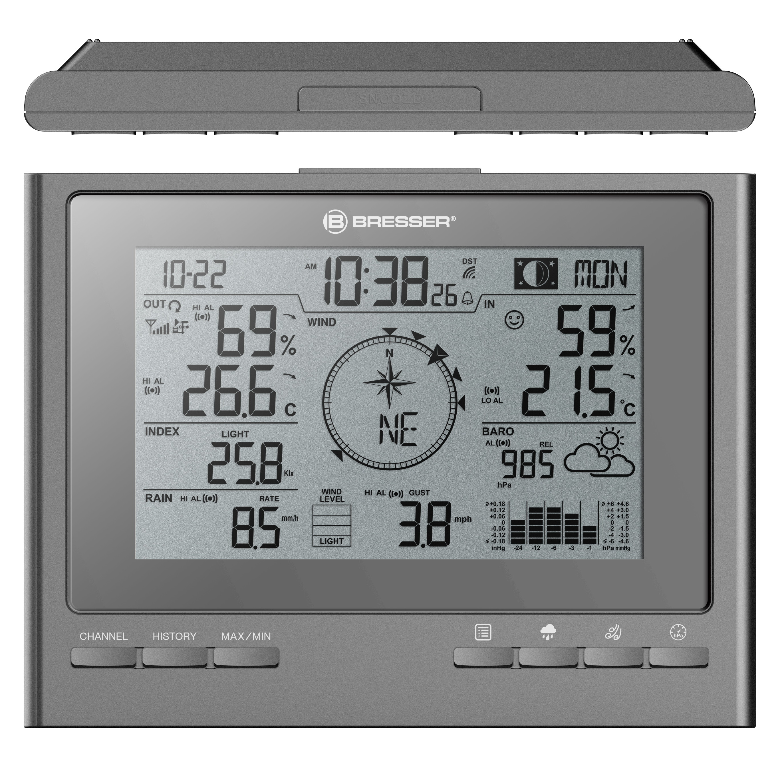 Ste už na obláčiku so svojou existujúcou meteorologickou stanicou 7 v 1 ClimateScout? Verte alebo nie, táto prídavná základňová stanica vás vynesie ešte vyššie do meteorologického neba. Pretože prečo využívať skvelé funkcie a zobrazenie počasia len v jednej miestnosti? Potrebujem údaje z existujúceho vonkajšieho snímača v spálni, aby som mal ráno v ruke to správne oblečenie na počasie jediným siahnutím do skrine? Alebo by si všetci členovia rodiny v obývačke mali vedieť urobiť vlastné závery o počasí rýchlym pohľadom na vonkajšiu teplotu, vonkajšiu vlhkosť, rýchlosť a smer vetra, množstvo zrážok, UV žiarenie a intenzitu svetla? Už žiadna otázka: s prídavnou základňovou stanicou budete v okamihu vedieť, akým smerom fúka miestny vietor v oboch miestnostiach. A vďaka svojmu jednoduchému, elegantnému dizajnu, ktorý bol špeciálne vyvinutý pre spoločnosť BRESSER, diskrétne zapadne do akéhokoľvek štýlu interiéru.