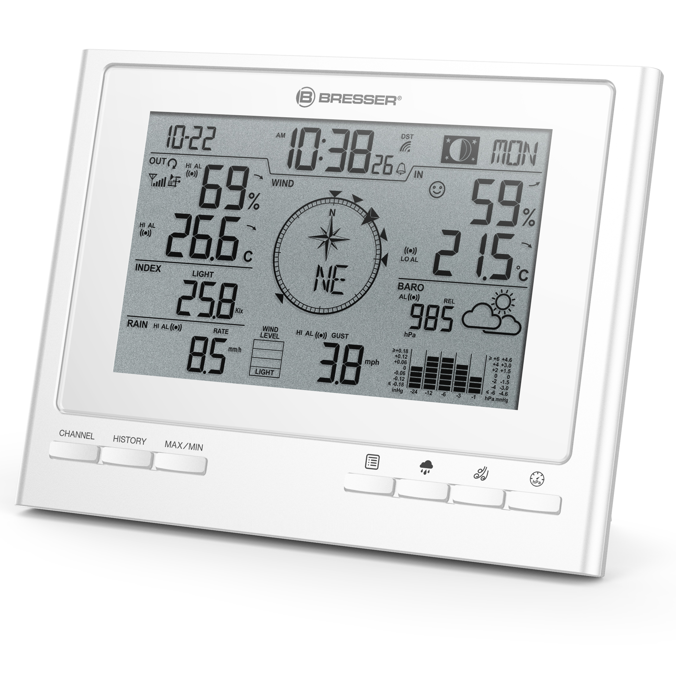 Ste už na obláčiku so svojou existujúcou meteorologickou stanicou 7 v 1 ClimateScout? Verte alebo nie, táto prídavná základňová stanica vás vynesie ešte vyššie do meteorologického neba. Pretože prečo využívať skvelé funkcie a zobrazenie počasia len v jednej miestnosti? Potrebujem údaje z existujúceho vonkajšieho snímača v spálni, aby som mal ráno v ruke to správne oblečenie na počasie jediným siahnutím do skrine? Alebo by si všetci členovia rodiny v obývačke mali vedieť urobiť vlastné závery o počasí rýchlym pohľadom na vonkajšiu teplotu, vonkajšiu vlhkosť, rýchlosť a smer vetra, množstvo zrážok, UV žiarenie a intenzitu svetla? Už žiadna otázka: s prídavnou základňovou stanicou budete v okamihu vedieť, akým smerom fúka miestny vietor v oboch miestnostiach. A vďaka svojmu jednoduchému, elegantnému dizajnu, ktorý bol špeciálne vyvinutý pre spoločnosť BRESSER, diskrétne zapadne do akéhokoľvek štýlu interiéru.