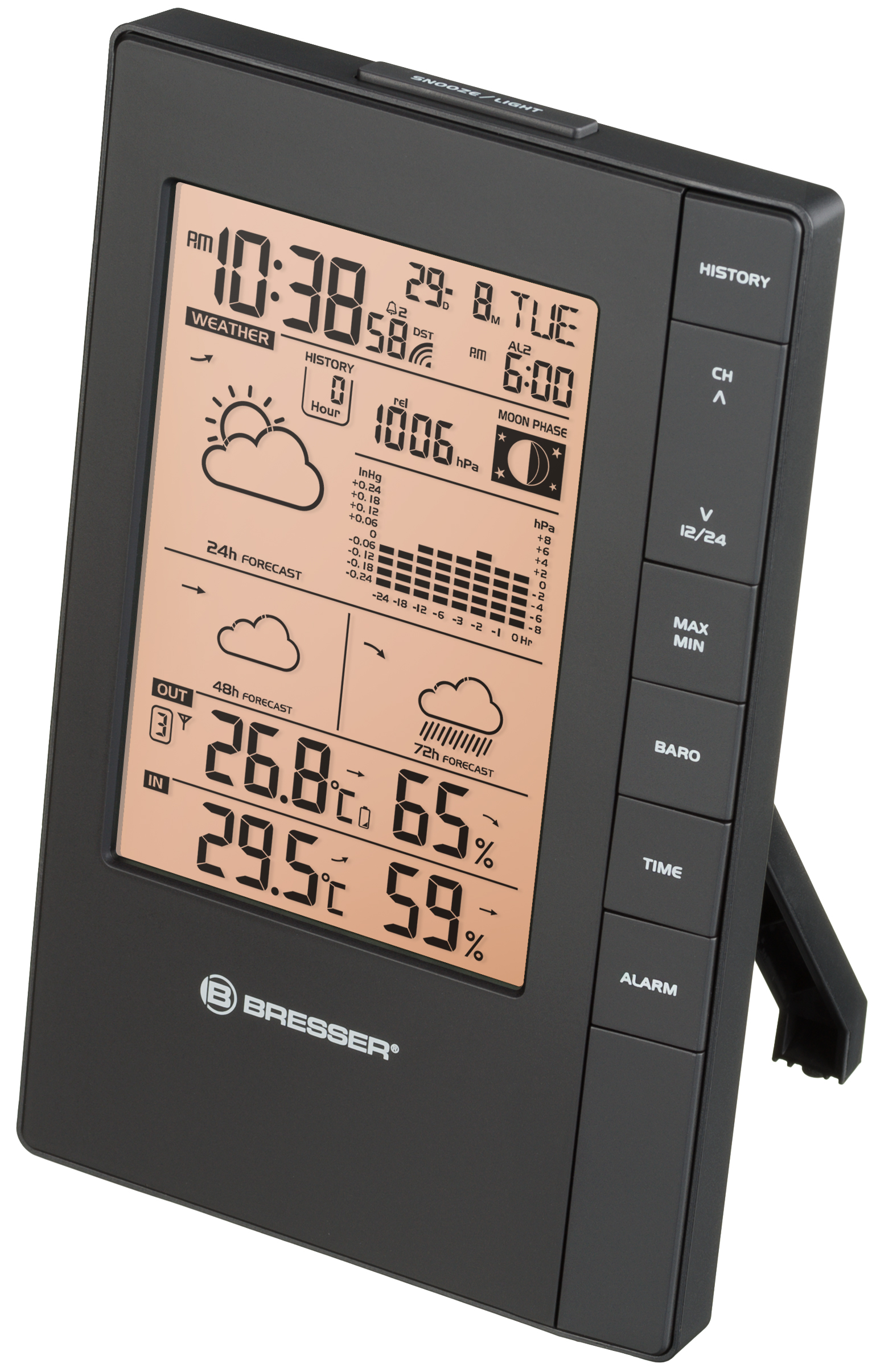 Táto základná stanica termo/hygrometra BRESSER Tendence FSX s 3-dňovou predpoveďou je prehľadná meteorologická stanica v modernom dizajne s vonkajším senzorom, ktorý poskytuje presné údaje za každých okolností. Vonkajší snímač napájaný batériou (batérie nie sú súčasťou balenia) s dosahom prenosu 30 metrov prenáša do základnej stanice presné údaje o počasí, ako sú teplota, vlhkosť, fázy mesiaca a tlak vzduchu. Tieto presné namerané hodnoty sú prehľadne štruktúrované na displeji základňovej stanice s podsvietením LED . Okrem toho je táto stanica vybavená výstrahou pred mrazom , ktorá vás pri teplotách -3° alebo nižších upozorní na budenie.