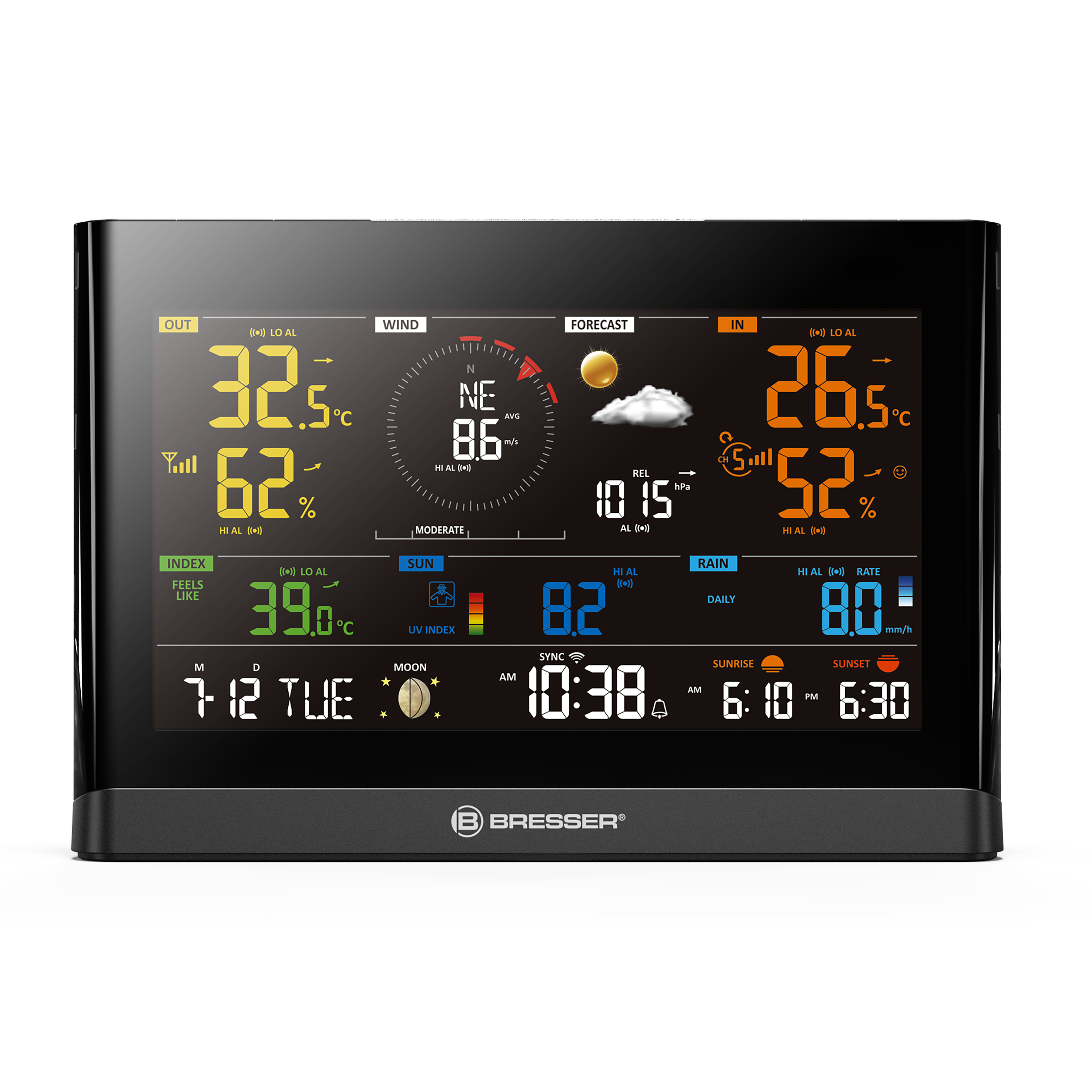 Už sa vám niekedy stalo, že vám bolo pri odchode z domu po kontrole teplomera zima? Preto meteostanica WLAN vypočíta vnímanú teplotu z príslušných hodnôt, vetra, vlhkosti a teploty. Ak si chcete v lete bezstarostne užívať teplé lúče, stačí sa pozrieť na aktuálny čas opaľovania v minútach. Ten vám presne povie, ako dlho si vaša pokožka ešte bude môcť užívať slnko v aktuálnych podmienkach. Meteostanica vám tiež ukáže, odkiaľ fúka vietor a aký je silný, a to zobrazením aktuálnych 16 smerov vetra a Beaufortovho indexu. A vďaka budíku vysokej/nízkej hodnoty môžete byť ľahko upozornení na príslušné zmeny.