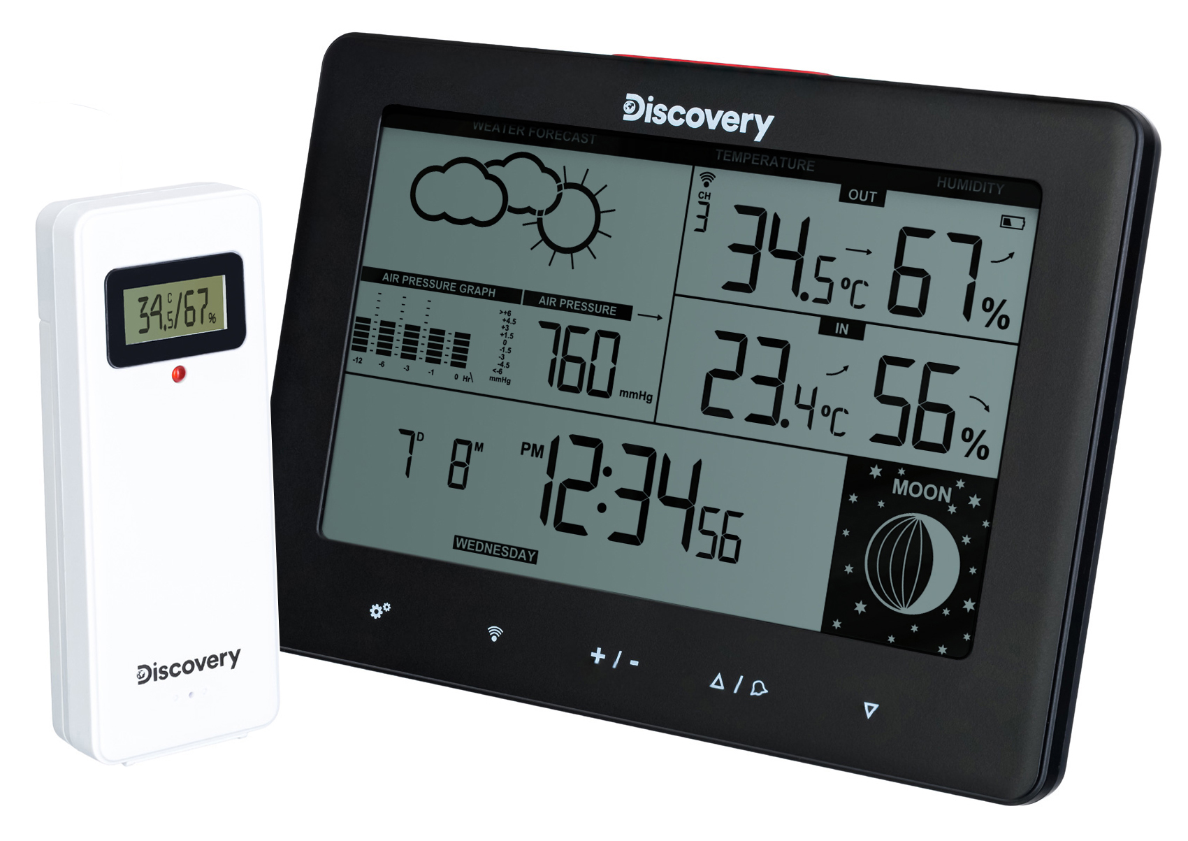 Meteorologická stanice Discovery Report WA10 s bohatou funkcionalitou a stylovým designem je ideální pro použití v domácnosti. Kromě měření teploty a vlhkosti, které umí většina ostatních meteorologických stanic, zobrazuje také úroveň atmosférického tlaku, graf jeho kolísání, poskytuje předpověď počasí na několik dní, ukazuje čas, datum a dokonce i aktuální fázi Měsíce.