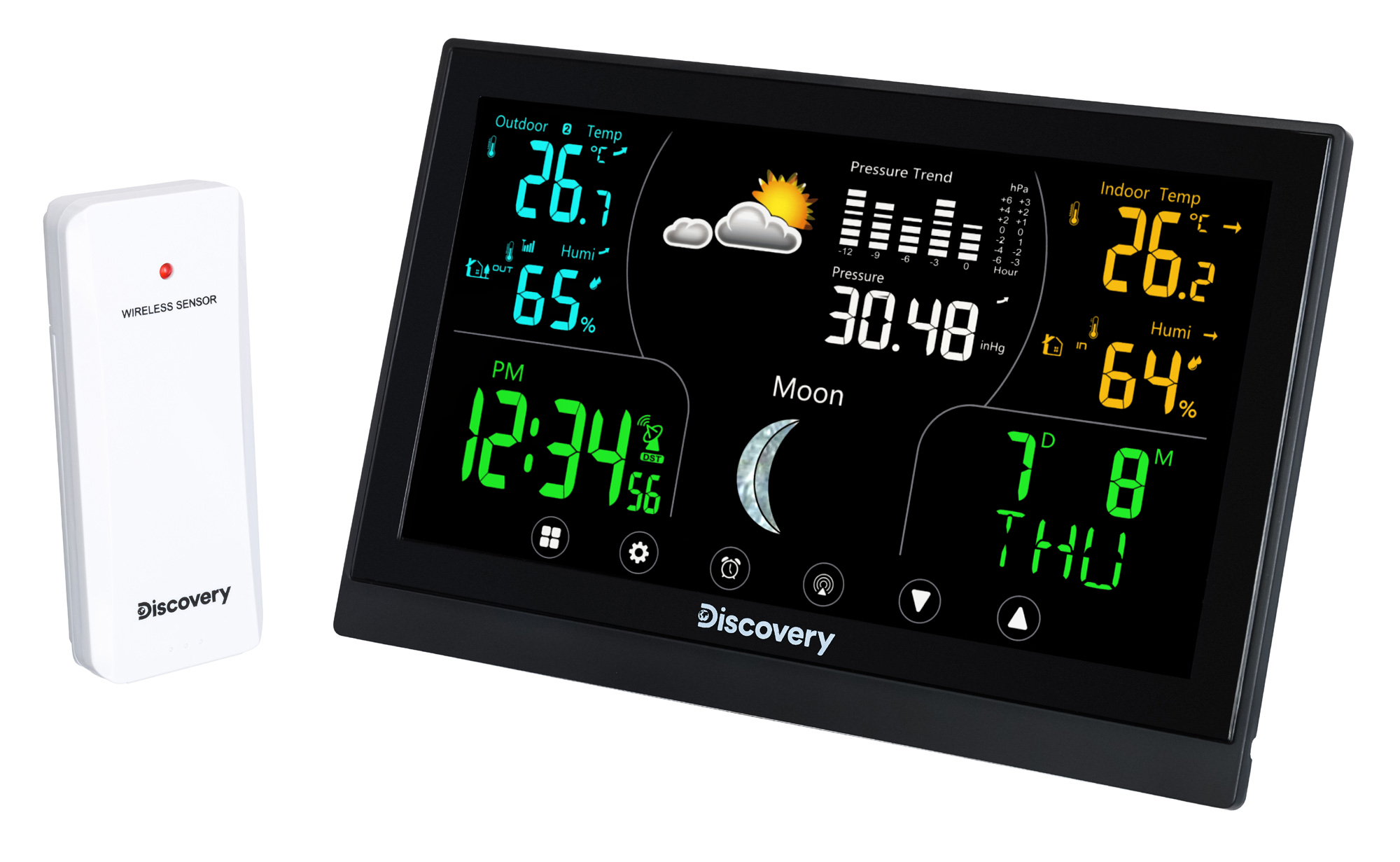 Discovery Report WA20 je elegantní domácí meteostanice s bezdrátovým vzdáleným senzorem, který je vhodný pro použití v bytě nebo na venkově. Senzor může být umístěn venku na okenní římse pro měření teploty a vlhkosti, zatímco hlavní modul je instalován v místnosti. Modul shromažďuje data z senzoru a provádí vlastní měření, která jsou zobrazována na vestavěné barevné obrazovce s vysokým kontrastem a podsvícením.