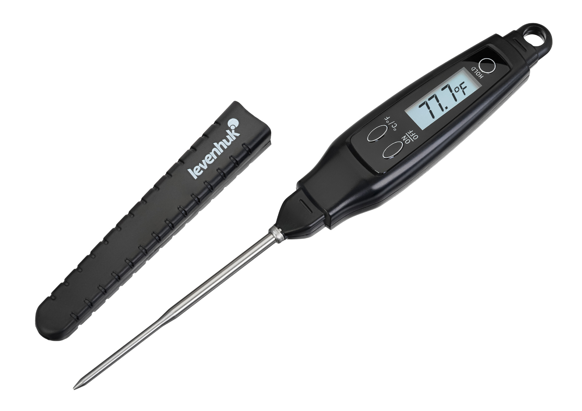 Kuchynský teplomer Levenhuk F10 je digitálny teplomer, ktorý vám pomôže pri varení rôznych jedál. Môžete ho používať na rýchlu kontrolu teploty produktov, aby ste si boli istí, že ich varíte správnym spôsobom. Táto funkcia je najdôležitejšia pri mäse, ale teplomer vám môže pomôcť aj pri omáčkach a pečených produktoch. Telesná sonda je užitočná na kontrolu teploty detského jedla a mnohých ďalších vecí.
