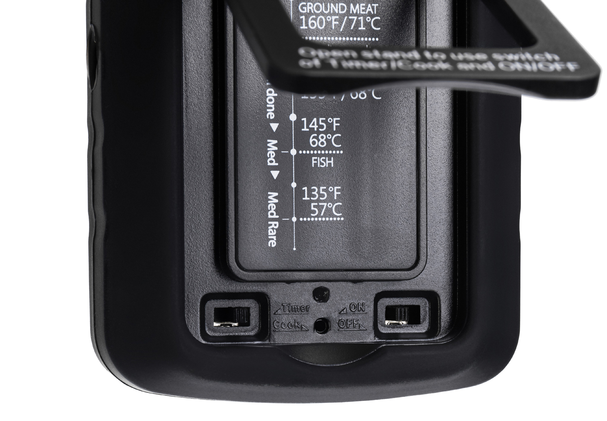 Hodnoty teploty sa zobrazujú na vestavenej čierno-bielej podsvietená obrazovke s vysokým kontrastom. Ovládacie prvky sú umiestnené nižšie: môžete ich použiť na výber sondy, ktorú chcete použiť, a zvoliť jednotky merania (°F alebo °C).