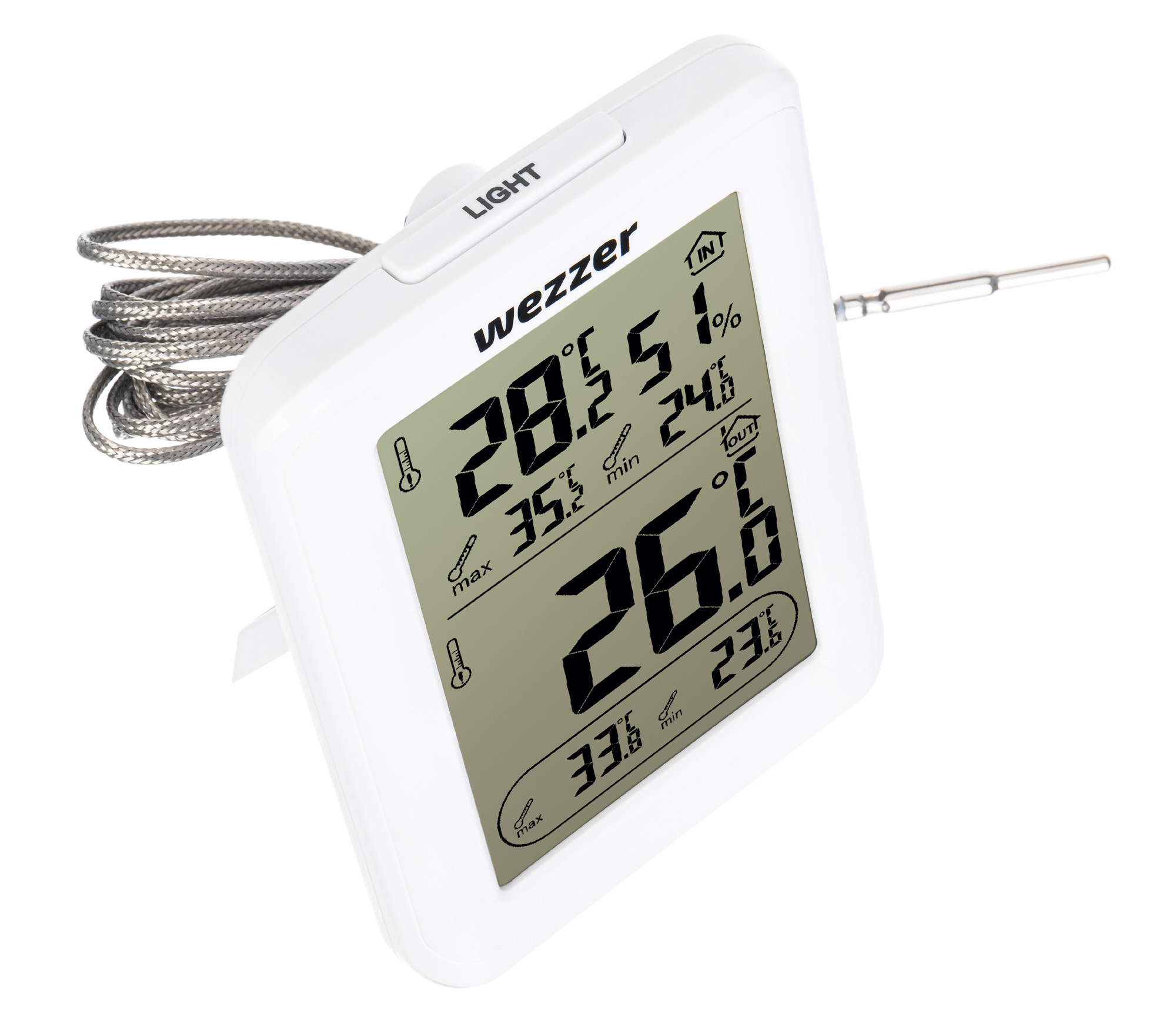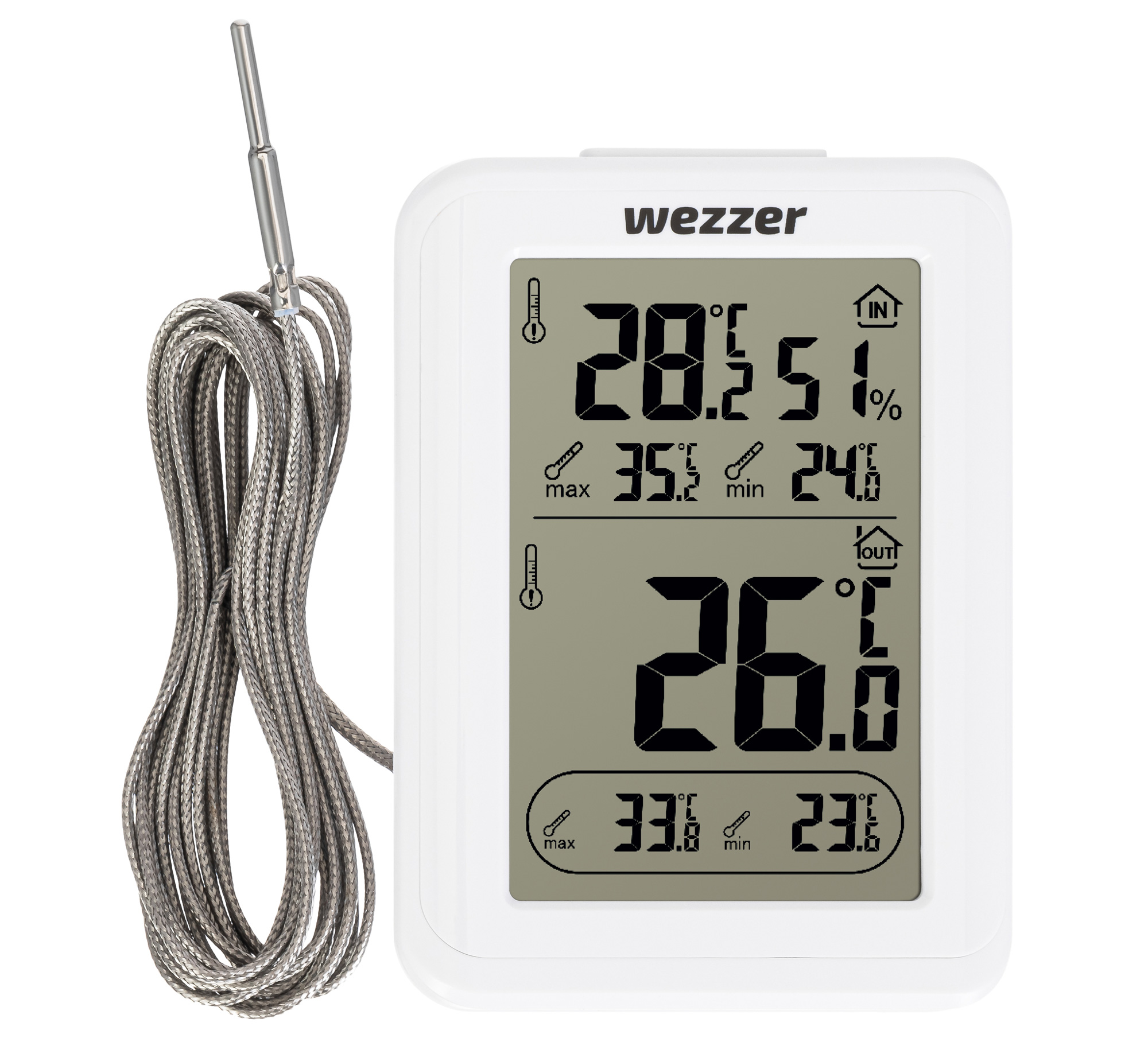 V horní části obrazovky se zobrazují údaje z hlavní jednotky a v dolní části naměřené hodnoty z termosondy. Kromě aktuální teploty obě jednotky indikují minimální a maximální hodnoty. Hlavní jednotka navíc měří úroveň vlhkosti vzduchu.