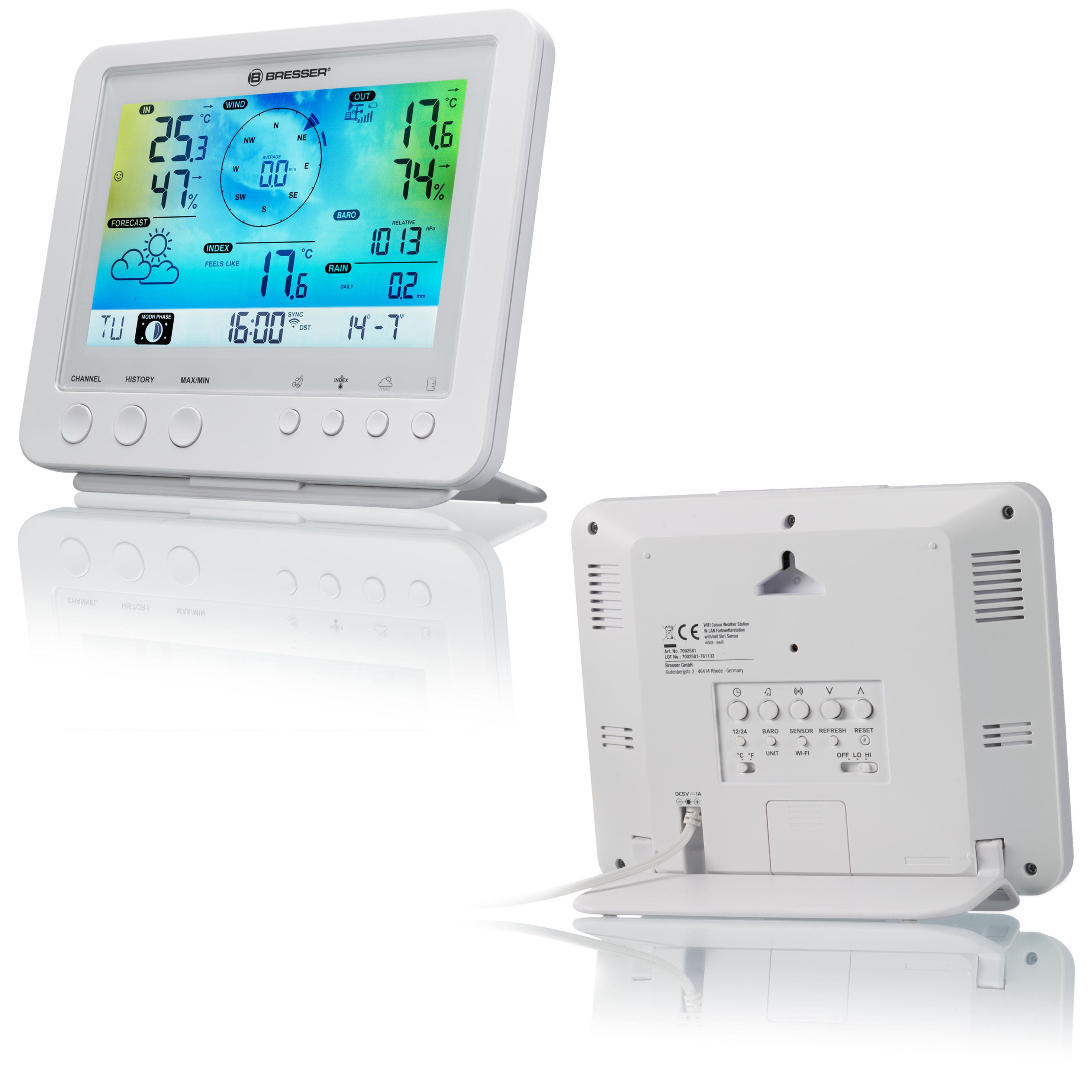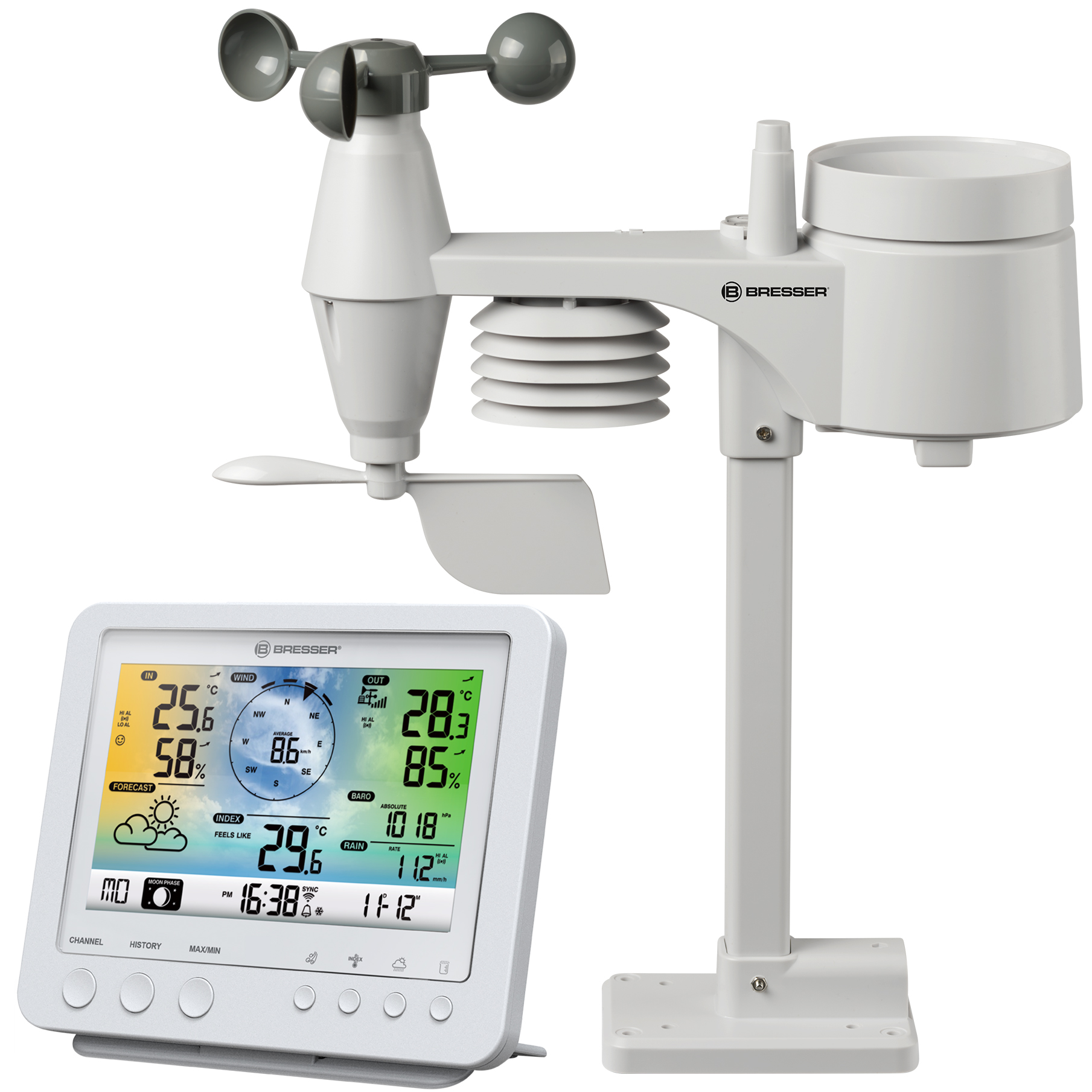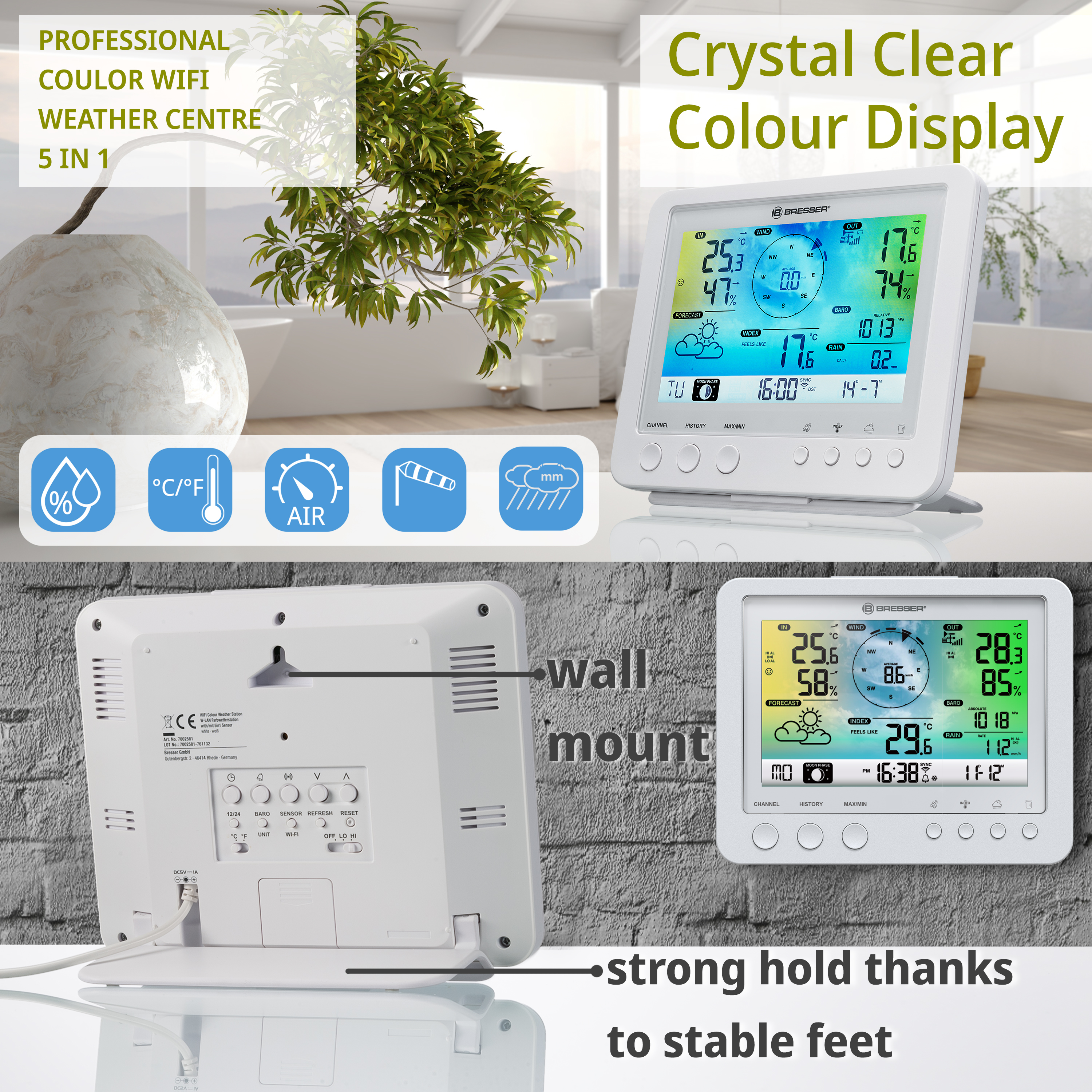 Nová farebná meteostanica BRESSER WLAN s profesionálnym senzorom 5 v 1 ponúka napriek kompaktnému dizajnu komplexné informačné služby. Multifunkčný profesionálny vonkajší snímač možno jednoducho nainštalovať pomocou dodaného montážneho príslušenstva !