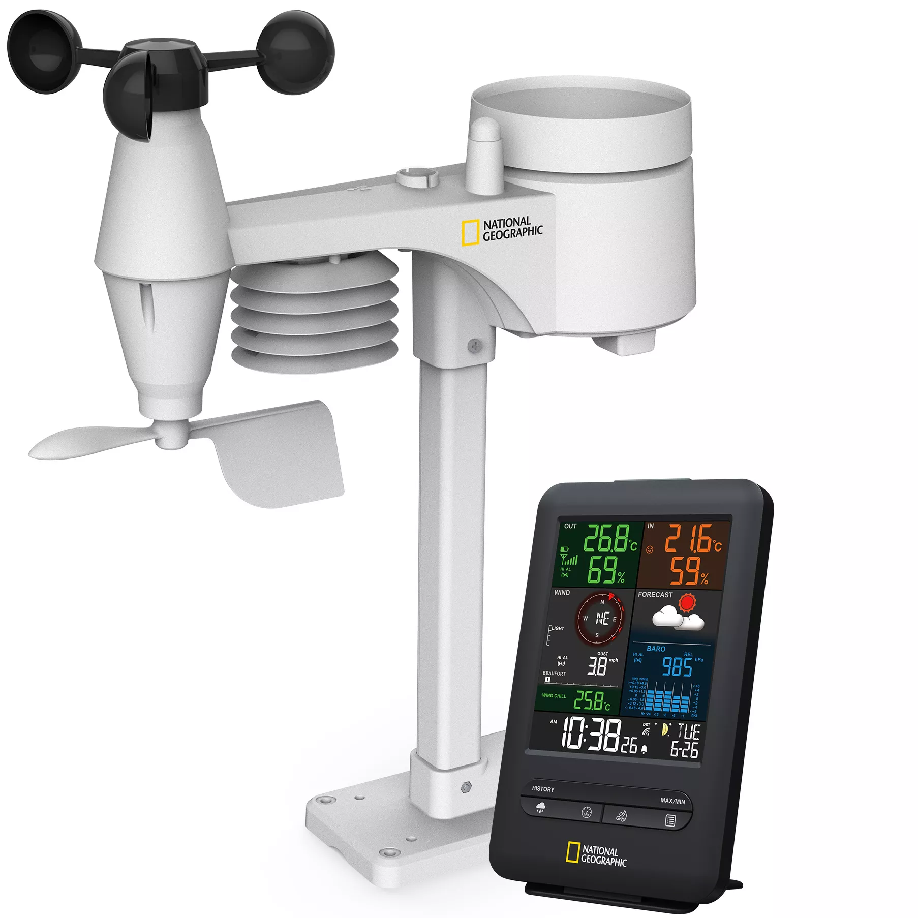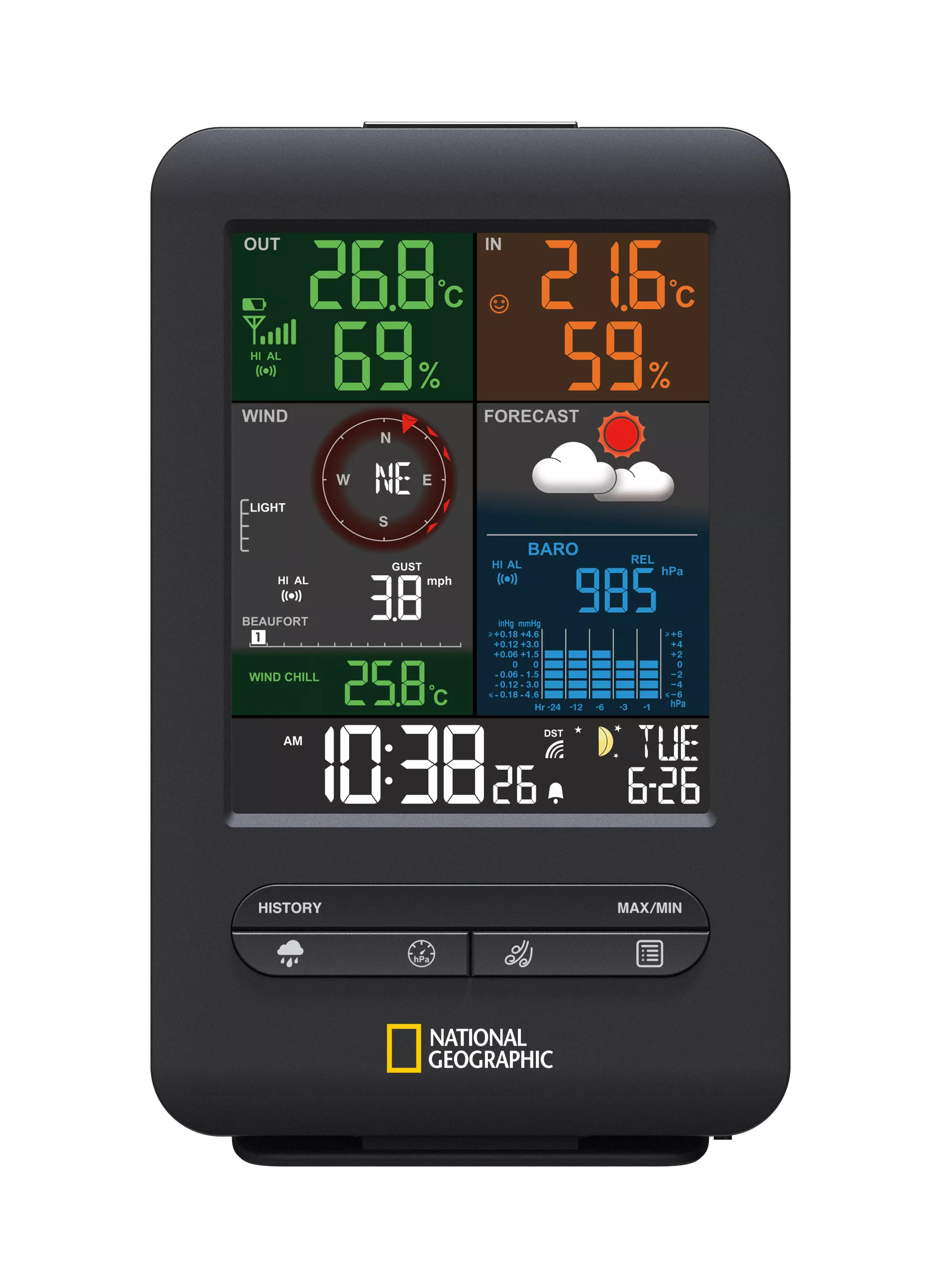 Nový dizajn meteorologickej stanice National Geographic s farebným displejom zaujme vynikajúcim výkonom a vynikajúcim pomerom ceny a kvality. Meteostanica spája kompaktný dizajn s komplexným informačným servisom. Nový, jedinečný farebný displej ponúka jasné informácie a ideálny prehľad v elegantnom dizajne.
