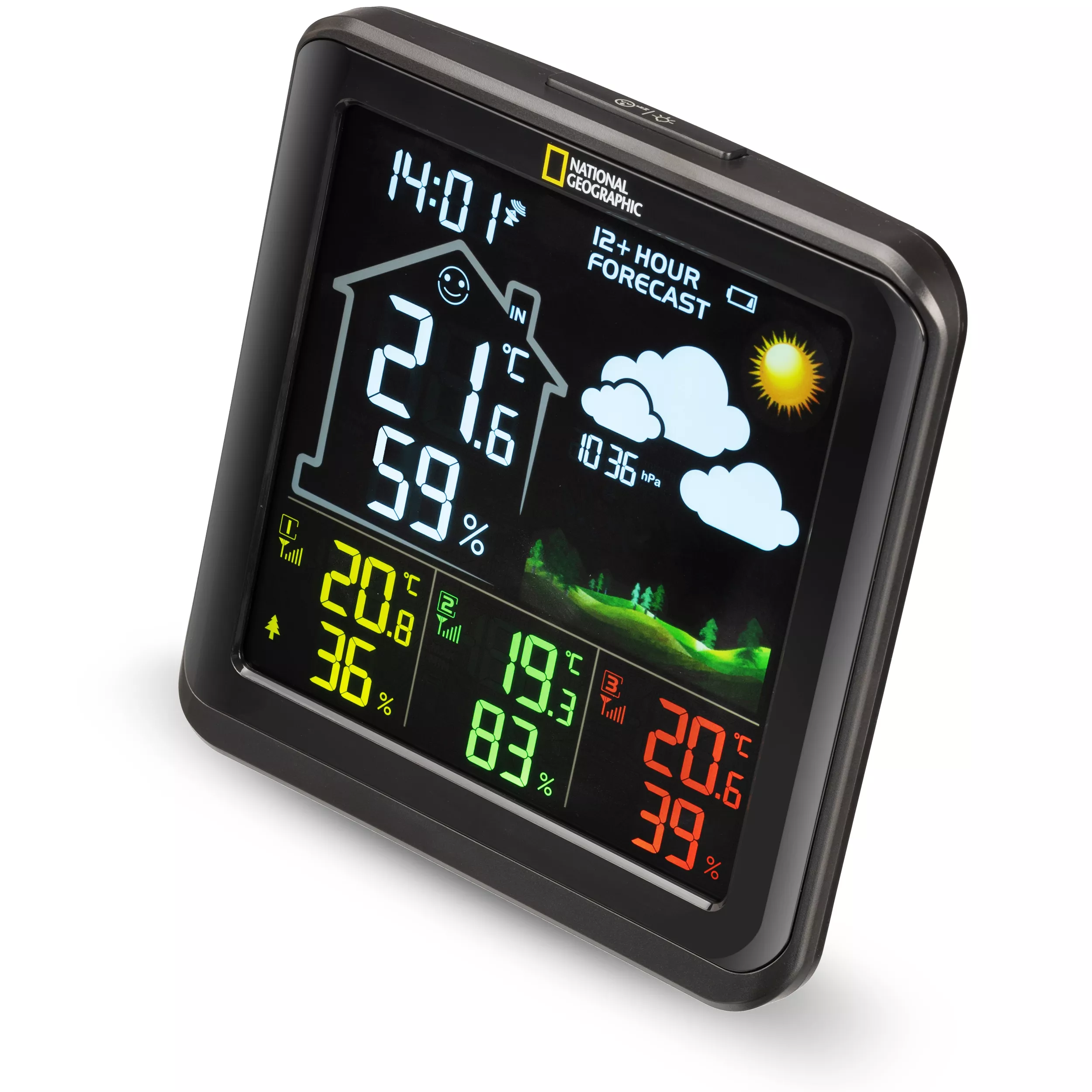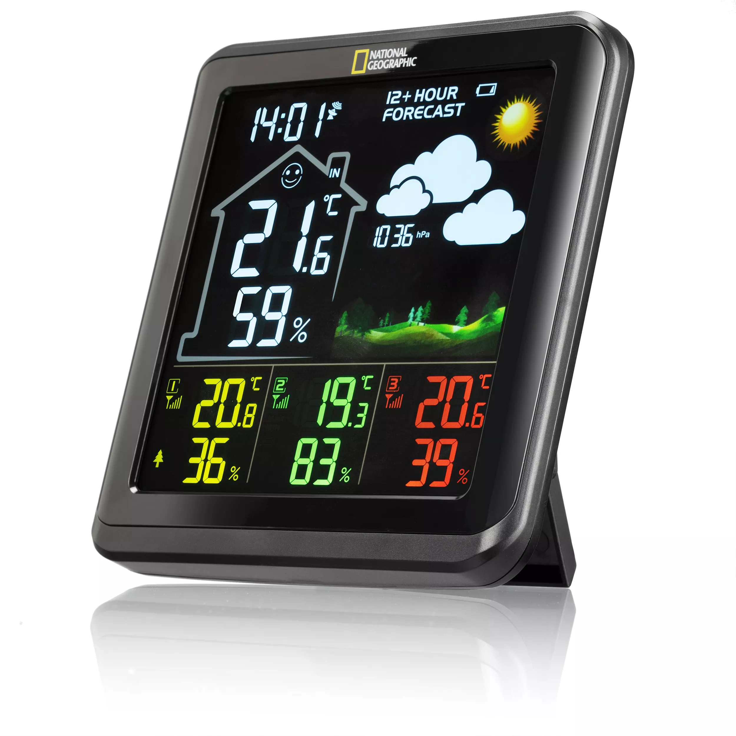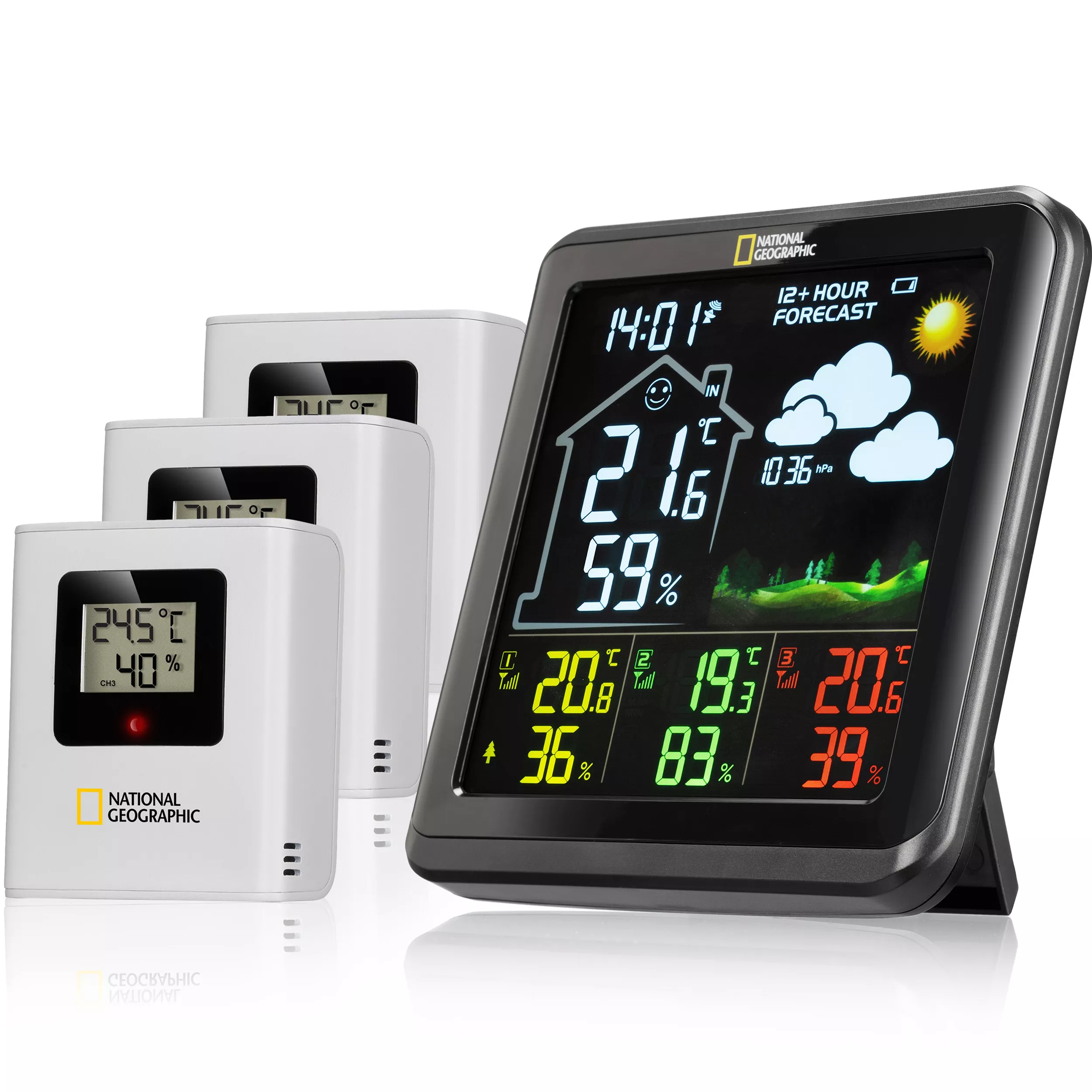 Meteostanica NATIONAL GEOGRAPHIC VA farebná meteostanica so 4 meracími bodmi v čiernej farbe zobrazuje všetky dôležité údaje o počasí na prvý pohľad. Súprava obsahuje 3 vonkajšie senzory a jeden zabudovaný senzor. Na prehľadnom farebnom displeji nájdete informácie ako teplota a vlhkosť pre vnútorné aj vonkajšie prostredie, ako aj presný čas prostredníctvom rádiového prenosu DCF. Okrem zabudovaného snímača v konzolovej jednotke (displeji) je stanica schopná prijímať údaje o teplote a vlhkosti z troch ďalších snímačov, ktoré sú súčasťou tejto súpravy. Jej použitie je preto veľmi všestranné, pretože snímače možno umiestniť buď vo vnútri, alebo vonku. Aká je teplota v detskej izbe, je v pivnici príliš vlhko, ako je vonku chladno? Všetky tieto otázky môžete zobraziť na jednom displeji. Stanica má funkciu časového posunu, takže hoci niektoré časti Spojeného kráľovstva môžu technicky prijímať signál európskeho času DCF (južné Anglicko), vaša stanica bude zobrazovať čas Spojeného kráľovstva. Vo všetkých častiach Spojeného kráľovstva, kde nie je možné prijímať časový signál, možno čas pomocou tejto stanice jednoducho nastaviť manuálne. Zobrazená predpoveď počasia je na nasledujúcich 12-24 hodín.