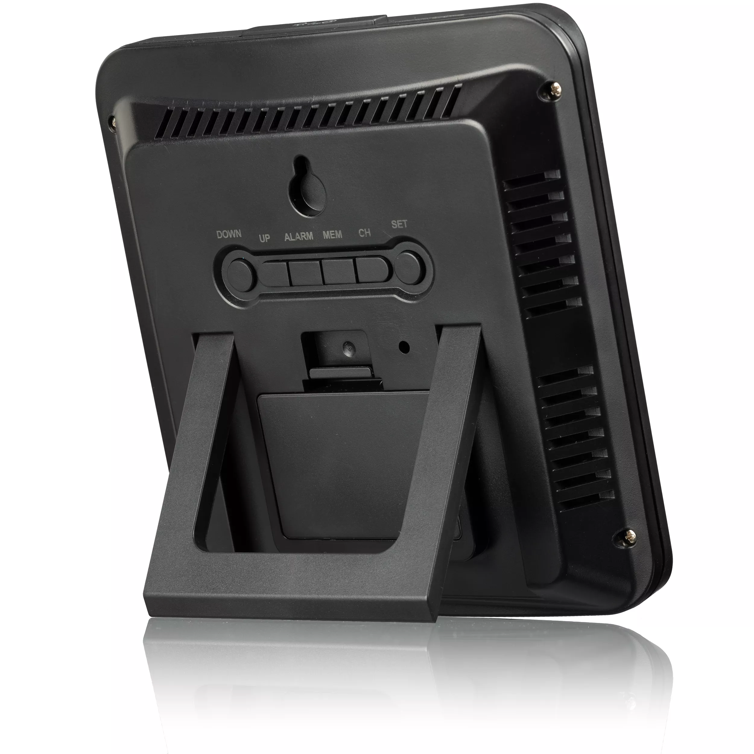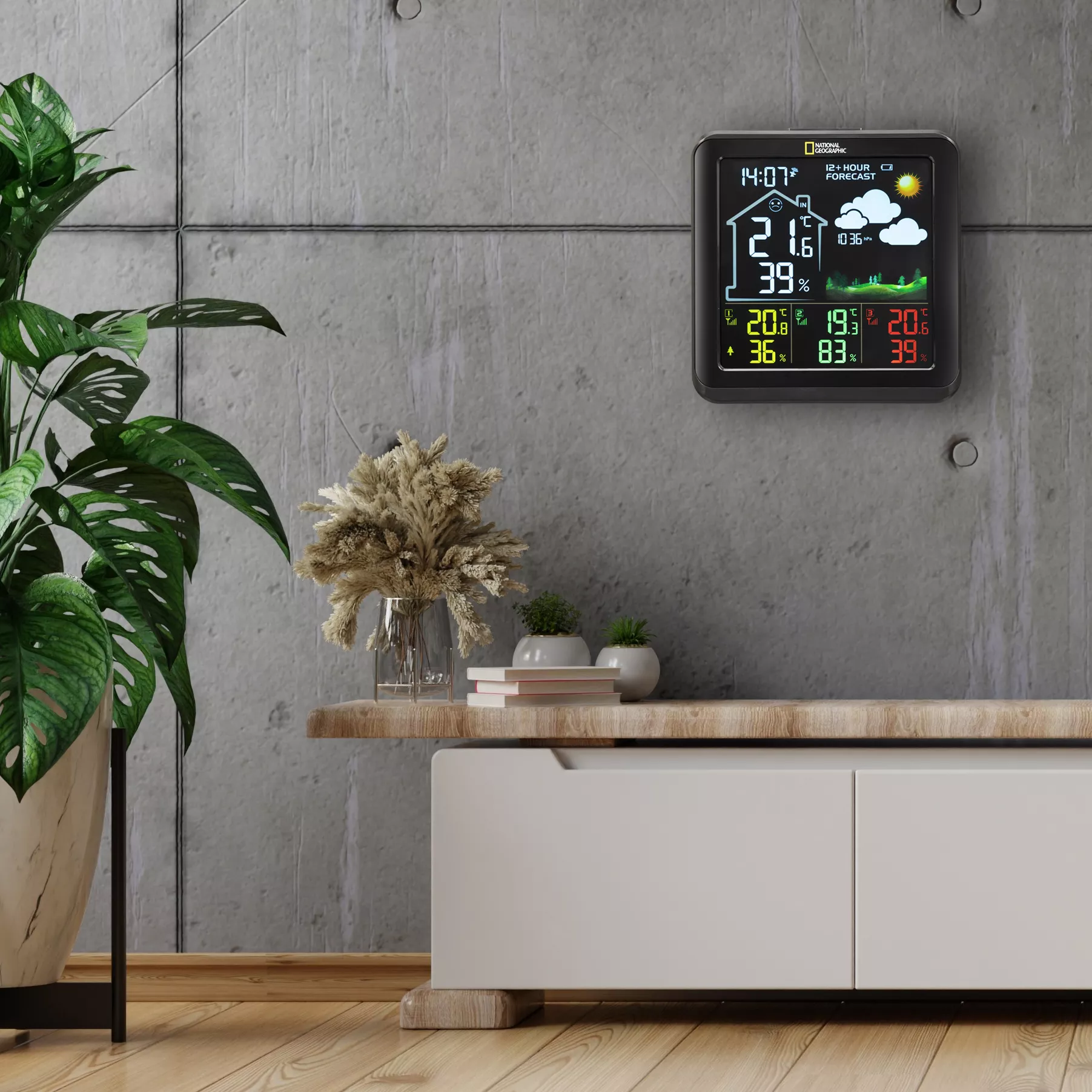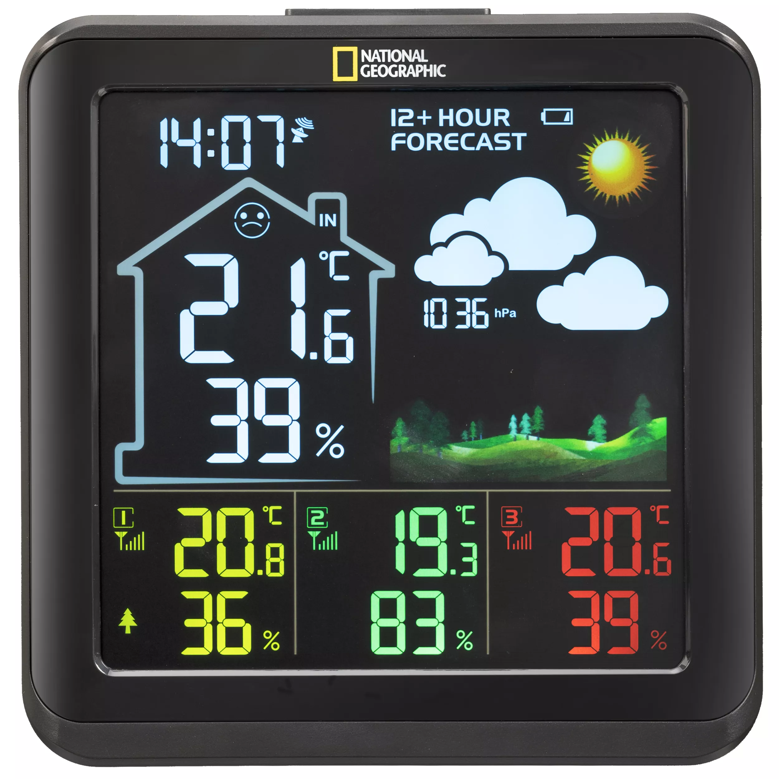 Meteostanica NATIONAL GEOGRAPHIC VA farebná meteostanica so 4 meracími bodmi v čiernej farbe zobrazuje všetky dôležité údaje o počasí na prvý pohľad. Súprava obsahuje 3 vonkajšie senzory a jeden zabudovaný senzor. Na prehľadnom farebnom displeji nájdete informácie ako teplota a vlhkosť pre vnútorné aj vonkajšie prostredie, ako aj presný čas prostredníctvom rádiového prenosu DCF. Okrem zabudovaného snímača v konzolovej jednotke (displeji) je stanica schopná prijímať údaje o teplote a vlhkosti z troch ďalších snímačov, ktoré sú súčasťou tejto súpravy. Jej použitie je preto veľmi všestranné, pretože snímače možno umiestniť buď vo vnútri, alebo vonku. Aká je teplota v detskej izbe, je v pivnici príliš vlhko, ako je vonku chladno? Všetky tieto otázky môžete zobraziť na jednom displeji. Stanica má funkciu časového posunu, takže hoci niektoré časti Spojeného kráľovstva môžu technicky prijímať signál európskeho času DCF (južné Anglicko), vaša stanica bude zobrazovať čas Spojeného kráľovstva. Vo všetkých častiach Spojeného kráľovstva, kde nie je možné prijímať časový signál, možno čas pomocou tejto stanice jednoducho nastaviť manuálne. Zobrazená predpoveď počasia je na nasledujúcich 12-24 hodín.