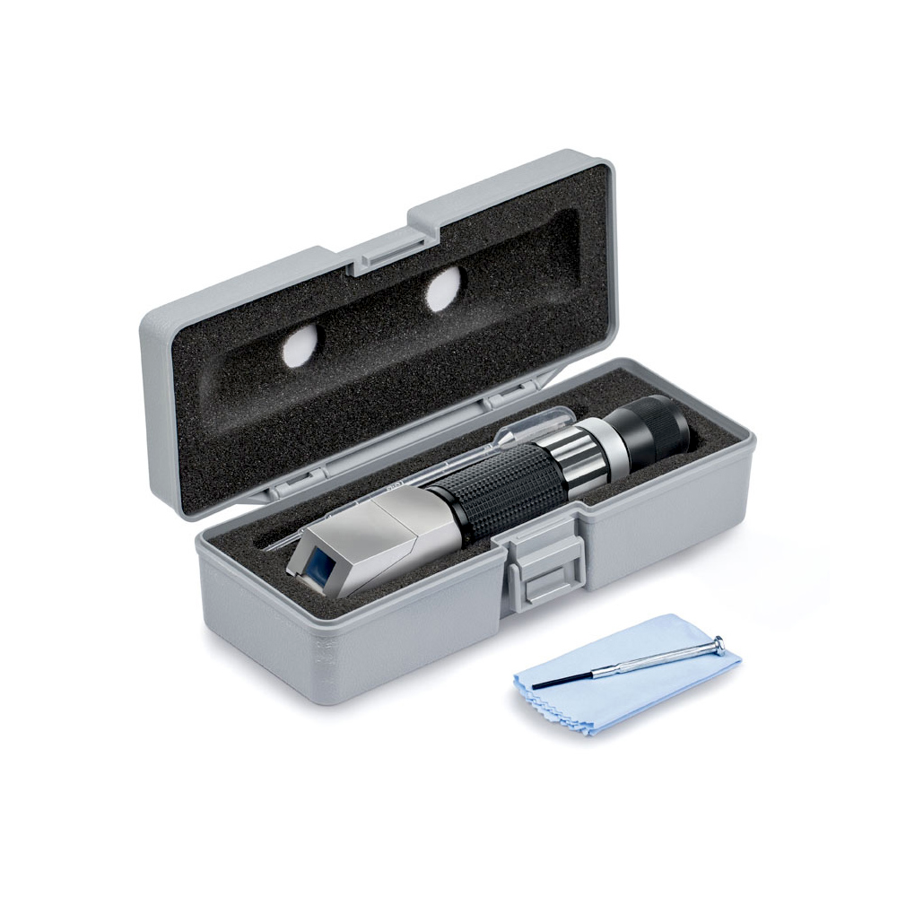 - Ručný analógový refraktometer — umožňuje rýchle meranie koncentrácie látok priamo v teréne alebo v laboratóriu.