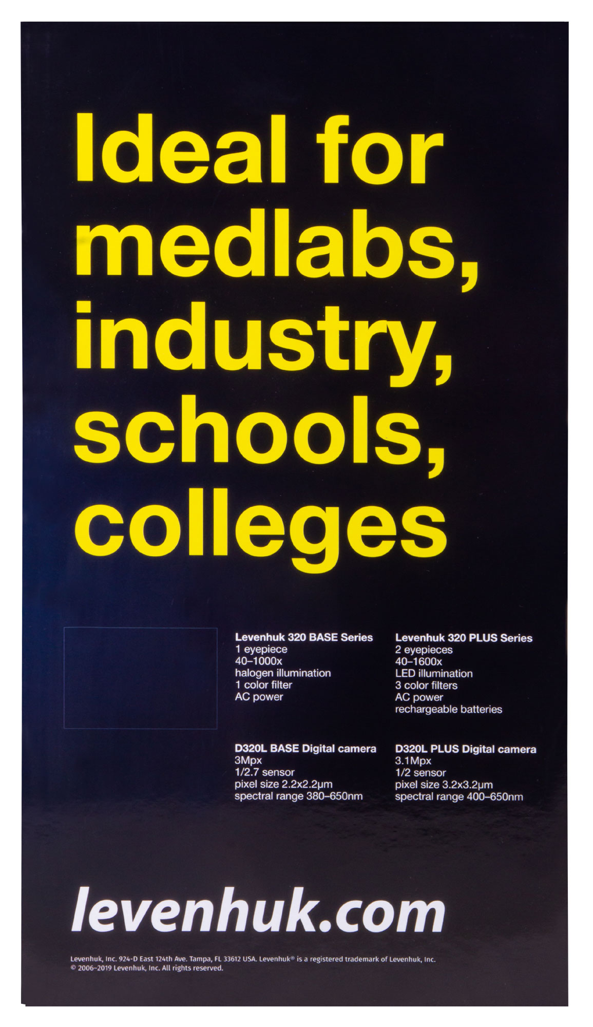 Levenhuk 320 BASE je laboratórny mikroskop, ktorý možno použiť na vykonávanie mikrovýskumu v rôznych oblastiach. Vykazuje skvelé výsledky pri štúdiu biochemických vzoriek, možno ho úspešne použiť na všeobecné klinické, morfologické a patologicko-anatomické pozorovania. Mikroskop Levenhuk 320 BASE je vynikajúcou voľbou pre vedecku a vzdelávaciu inštitúciu, kliniku alebo laboratórium.