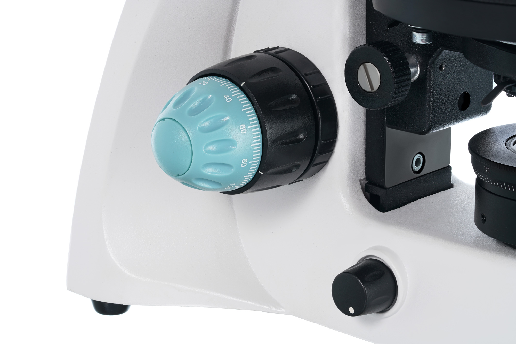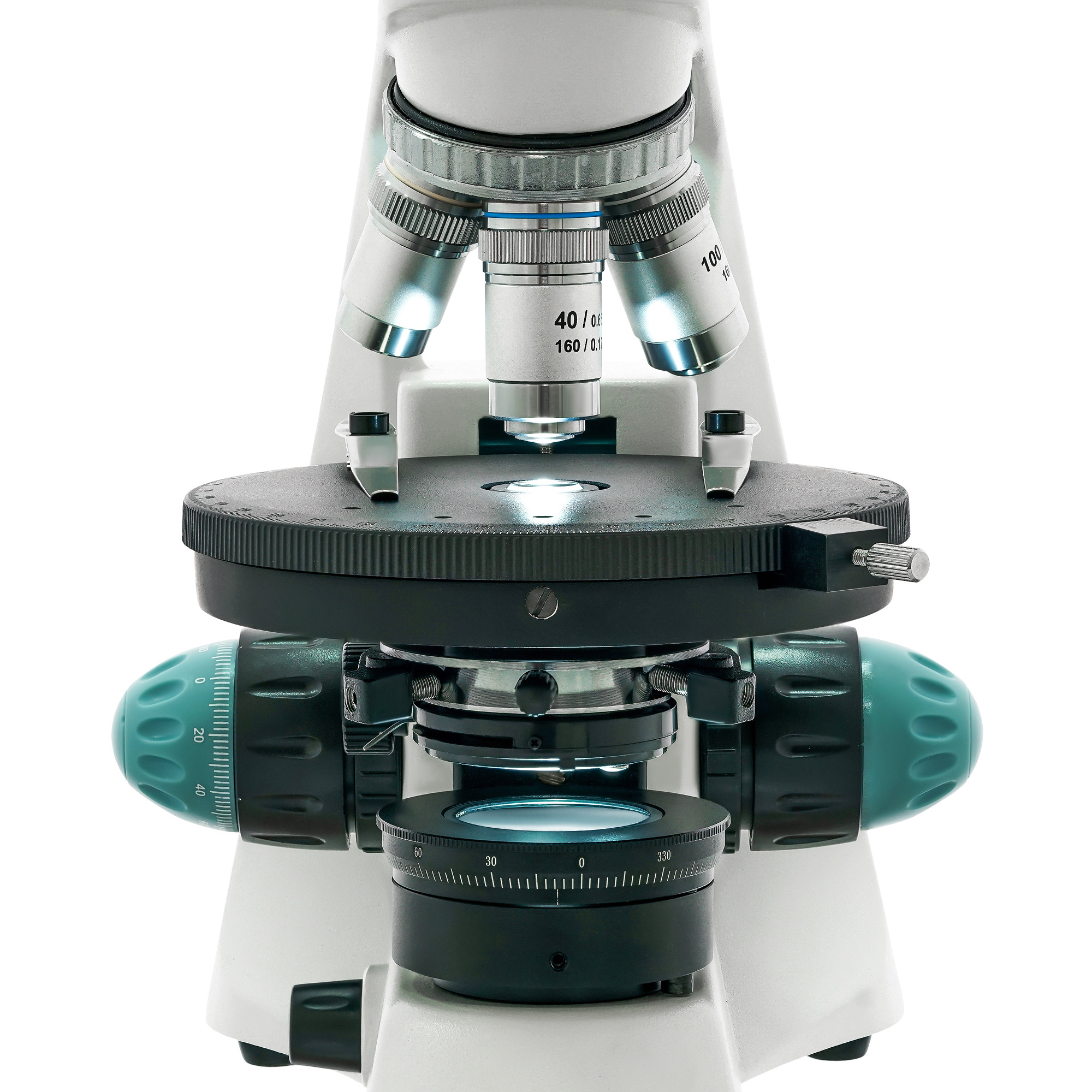Pracovný stolík je okrúhly a otočný, na upevnenie mikroskopických preparátov sa používajú štandardné svorky. Pod týmto stolíkom sa nachádza kondenzor s irisovou clonou a držiakom filtra. Úplne dole je osvetľovacia jednotka pozostávajúca z výkonného 3-wattového LED svetla s kolektorom. Jas osvetlenia možno regulovať. Mikroskop je navyše vybavený vstavaným polarizátorom a analyzátorom.