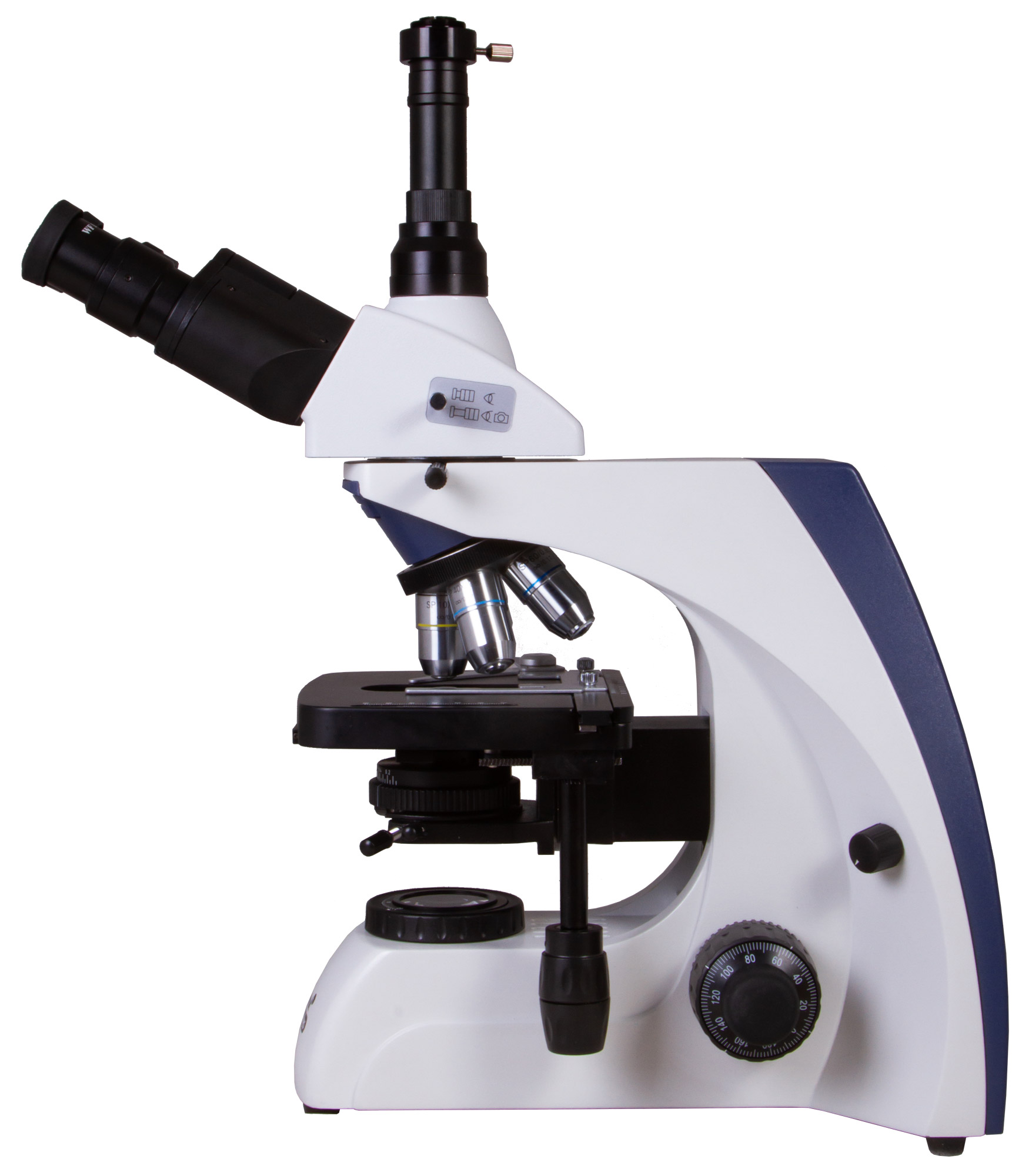 Trinokulárna hlavica pozostáva z binokulárnej časti pre vizuálne pozorovanie a vertikálneho tubusu pre pripojenie digitálnej kamery (nie je súčasťou balenia). Integrovaný beam splitter umožňuje súčasné pozorovanie a digitálny záznam bez prerušenia práce. Hlavica je otočná o 360° a sklon 30° zaručuje ergonomické používanie.