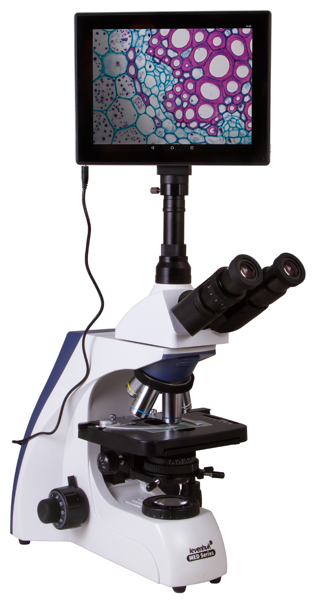 Mikroskop Levenhuk MED D35T LCD je profesionálny trinokulárny digitálny mikroskop navrhnutý pre náročné mikroskopické analýzy v medicíne, biochemii a biologickom výskume. Je vybavený 5 Mpx kamerou s integrovaným LCD displejom, ktorý umožňuje pozorovanie v reálnom čase bez nutnosti použitia okulárov. Planachromatická optika s korekciou na nekonečno zabezpečuje ostrý obraz s vysokým kontrastom a rovinným zorným poľom. Mikroskop podporuje Köhlerovo osvetlenie aj olejovú imerziu.