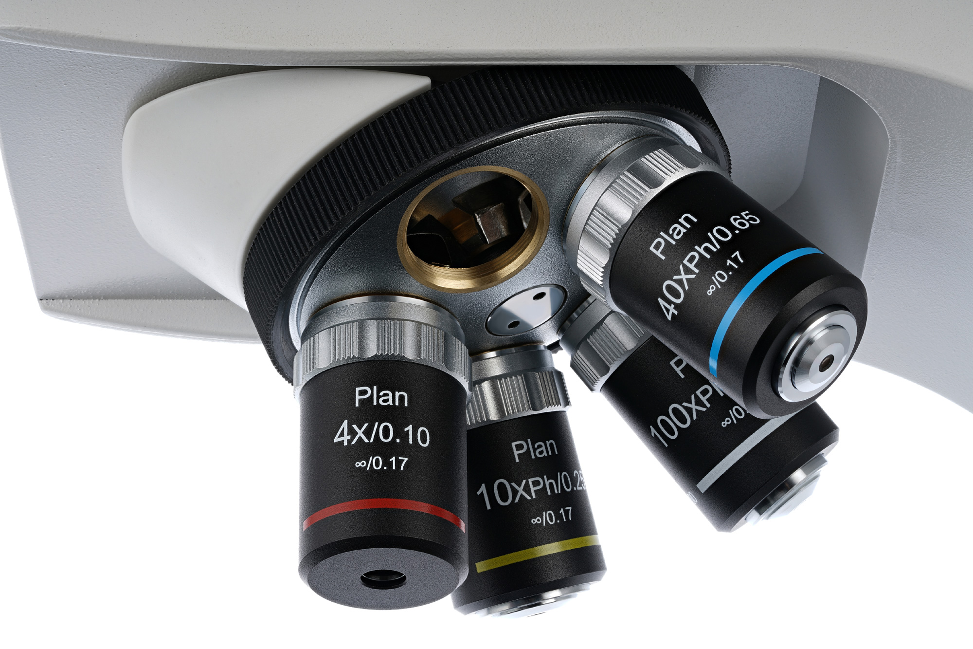 - planachromatické objektívy 4×, 10×, 40× a 100× (olej)