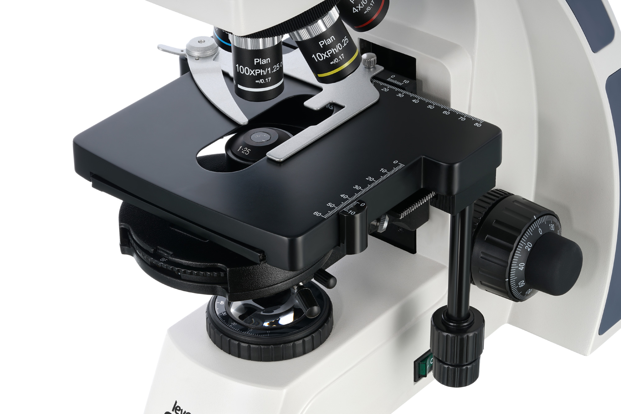Dvojosý mechanický stolík so stupnicou umožňuje presné polohovanie preparátu. Koaxiálne zaostrovanie zabezpečuje plynulé a presné nastavenie ostrosti.