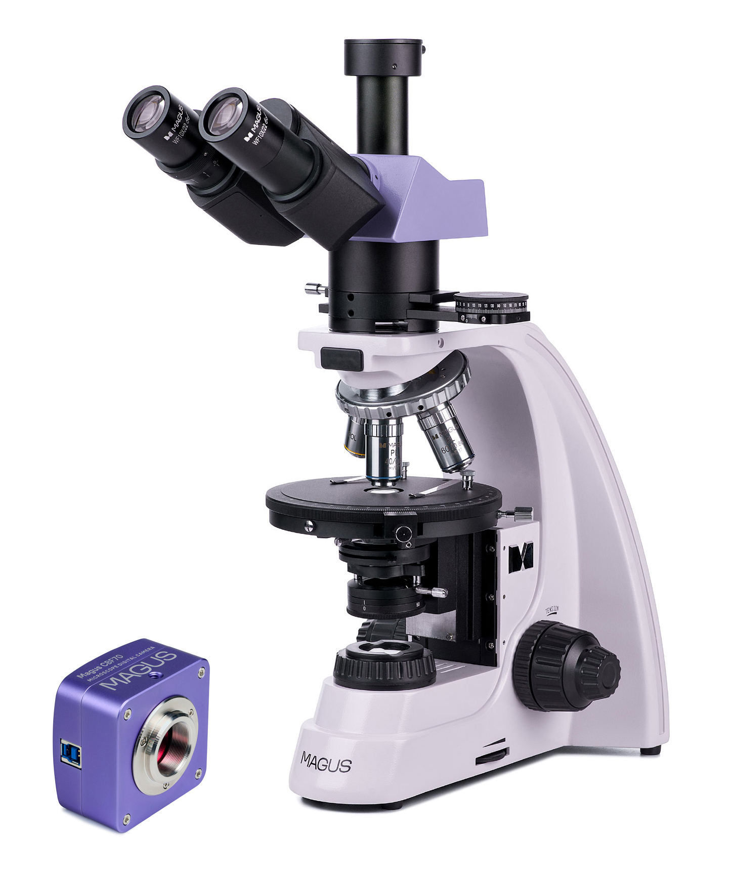Súčasťou zostavy je profesionálna vedecká kamera MAGUS CBF70, navrhnutá pre použitie s objektívmi 4×, 10×, 20× a 40×. Kamera umožňuje fotografovanie, záznam videa, prezentáciu obrazu na externej obrazovke a lineárne aj uhlové merania po kalibrácii softvéru. Vysoké rozlíšenie je ideálne pre detailnú dokumentáciu, zatiaľ čo vysoká snímková frekvencia zabezpečuje plynulé video bez trhania.