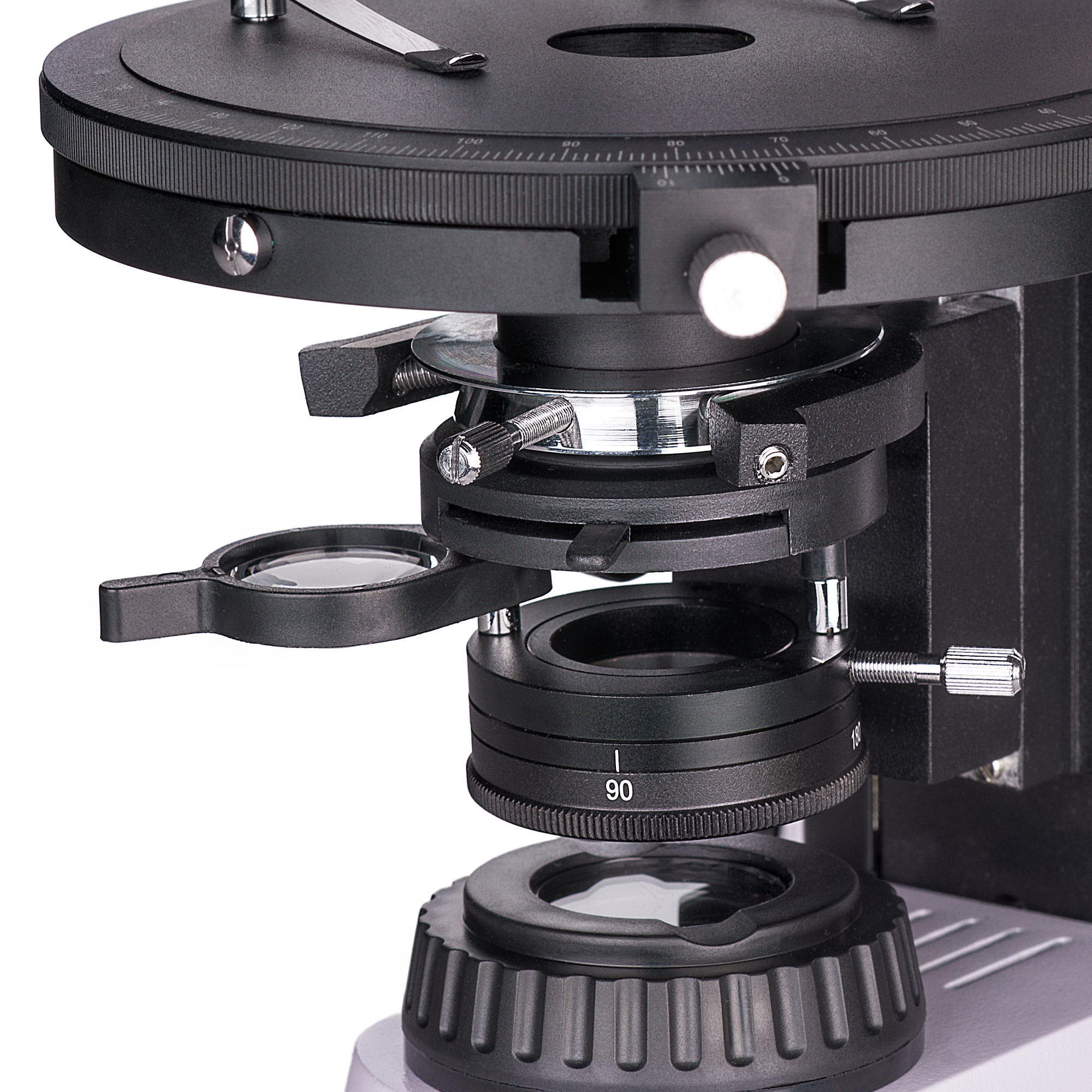 Otočný pracovný stolík umožňuje meniť orientáciu vzorky voči polarizačnej rovine. Je vybavený uhlovou stupnicou s presnosťou odčítania až 0,1° a je centrovateľný voči optickej osi mikroskopu. Koaxiálne ovládače hrubého a jemného zaostrovania sú umiestnené nízko na stojane pre maximálny komfort pri práci.