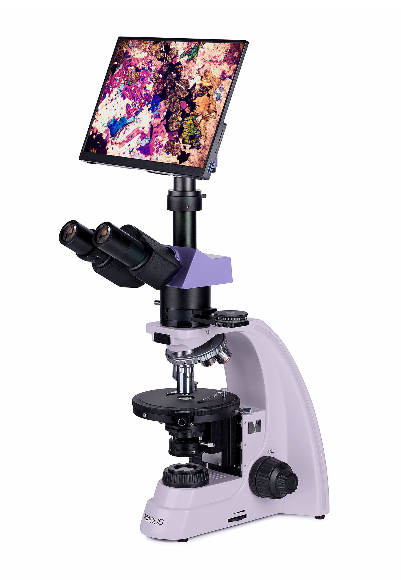 Polarizačný mikroskop MAGUS Pol 800 je profesionálny trinokulárny mikroskop určený na pozorovanie anizotropných vzoriek v prechádzajúcom svetle, a to v jasnom poli aj v polarizovanom svetle. Je vhodný na analýzu biologických, geologických a polymérnych preparátov, pričom optické prvky bez vnútorného pnutia zabezpečujú čistý, kontrastný a verný obraz bez parazitných lomov. Vďaka polarizačnej výbave, Bertrandovej šošovke a možnosti digitálnej dokumentácie je ideálny pre medicínu, súdne lekárstvo, mineralógiu, petrografiu aj kryštalografiu.