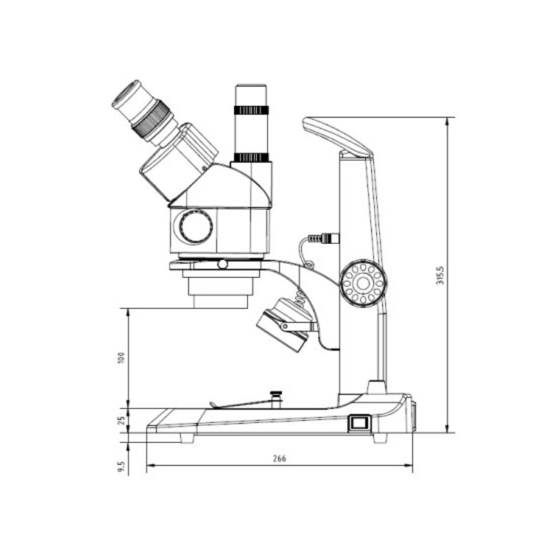 - Statív : Veľký ozubený statív, ergonomicky ideálny pre uvoľnenú polohu rúk. Odlievaný hliník smaltovaný pieckou. S priehľadnou a čiernobielou stolovou doskou. Hrubé nastavenie pomocou otočného regulátora odporu.