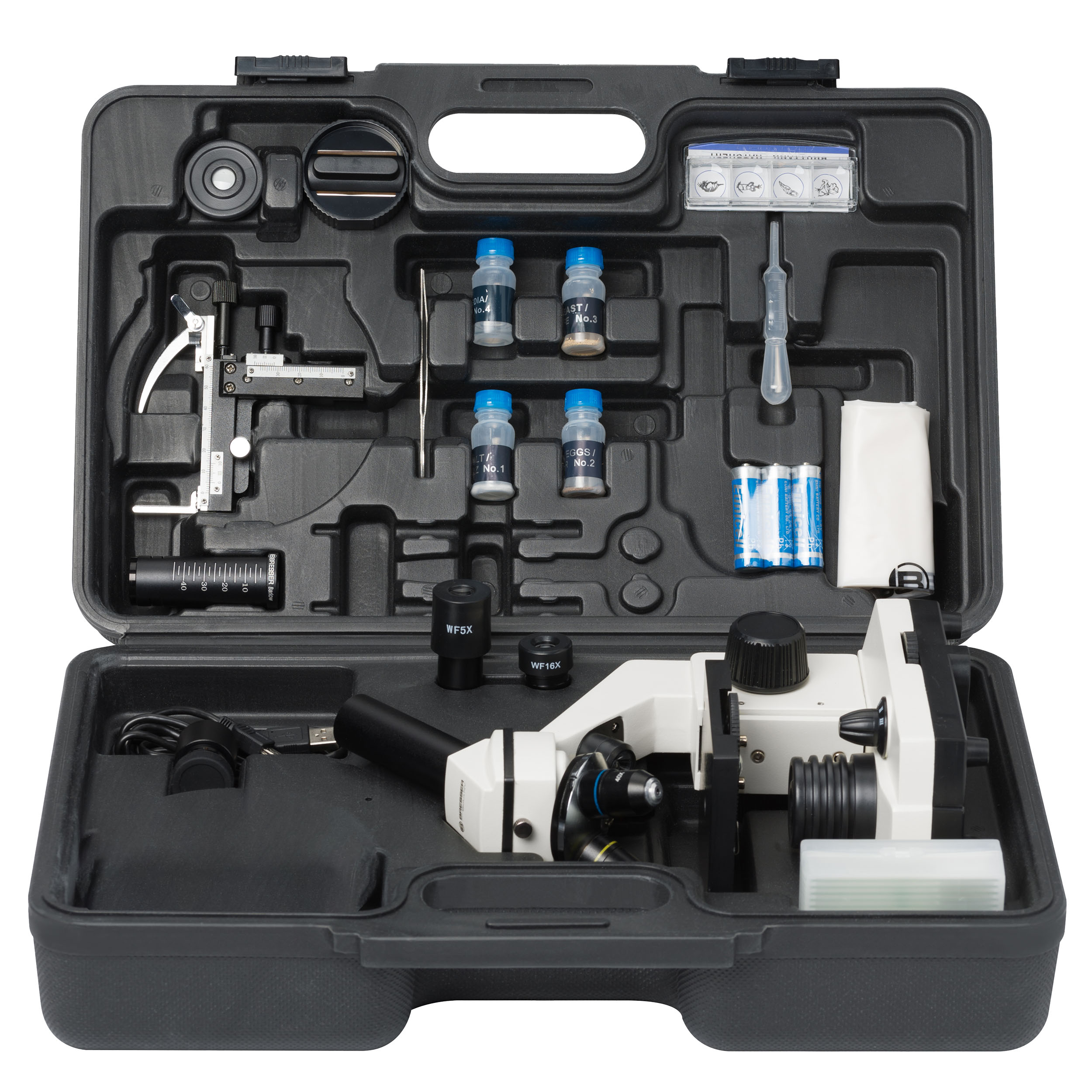 Napájanie zabezpečujú batérie (tri batérie AA), takže mikroskopovanie je možné aj bez elektrickej zásuvky v blízkosti. Okrem protiprachového krytu je súčasťou príslušenstva 5 trvalých preparátov a 5 prázdnych mikroskopických sklíčok a krycích skiel na zhotovenie vlastných preparátov. Preparáty si môžete prezerať na monitore počítača pomocou vysokokvalitnej HD okulárovej kamery, ktorá je súčasťou dodávky. Softvér pre systém Windows, ktorý je k dispozícii na stiahnutie(kompatibilný s Win 10 / 11), umožňuje aj jednoduché zhotovovanie fotografií a videozáznamov na počítači. Každý tak môže zdokumentovať svoje výsledky alebo sa o ne podeliť s ostatnými!