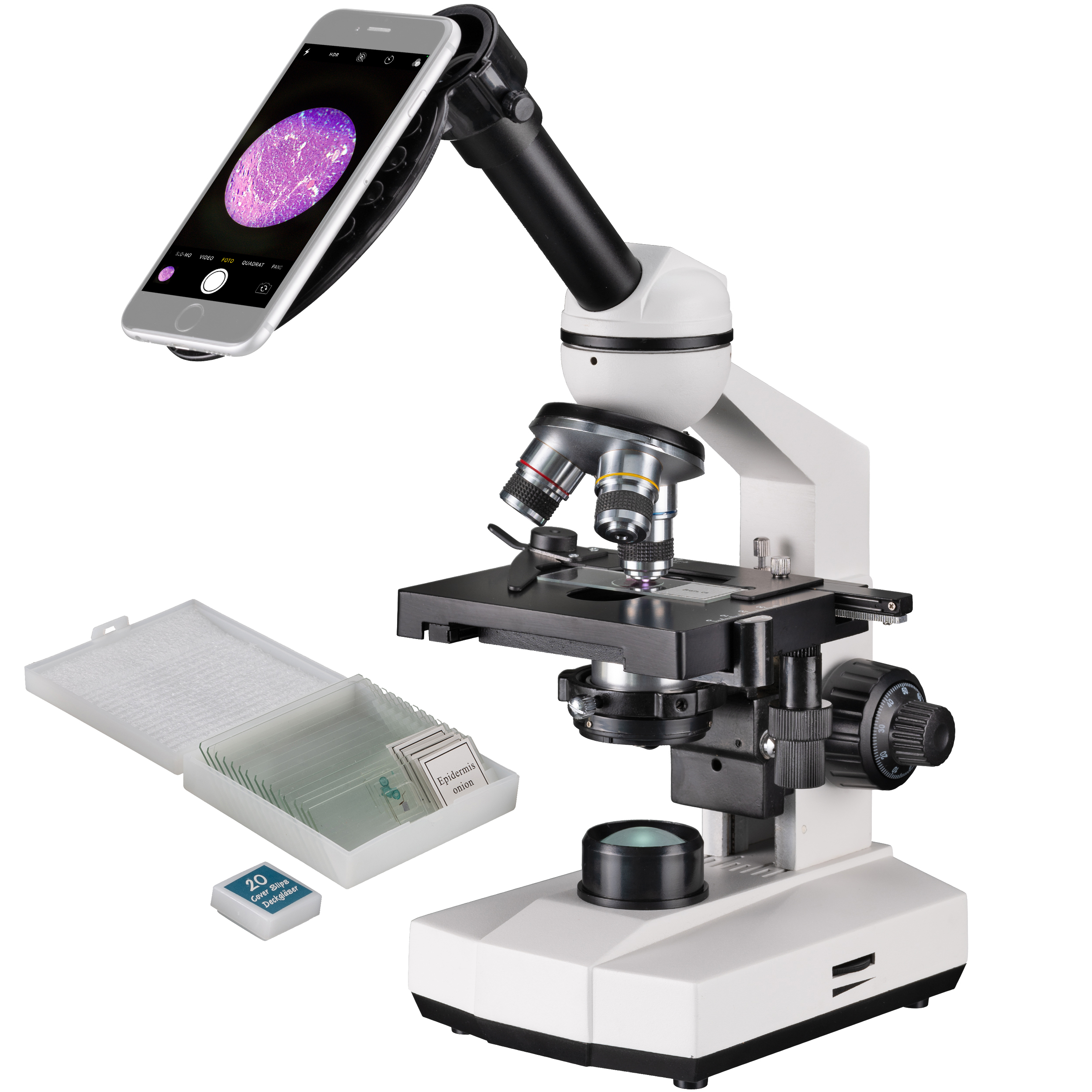 Praktické puzdro poskytuje optimálnu ochranu počas prepravy alebo skladovania. Držiak na smartfón vám pomôže zdokumentovať fotografie a videá na mikroskope.
