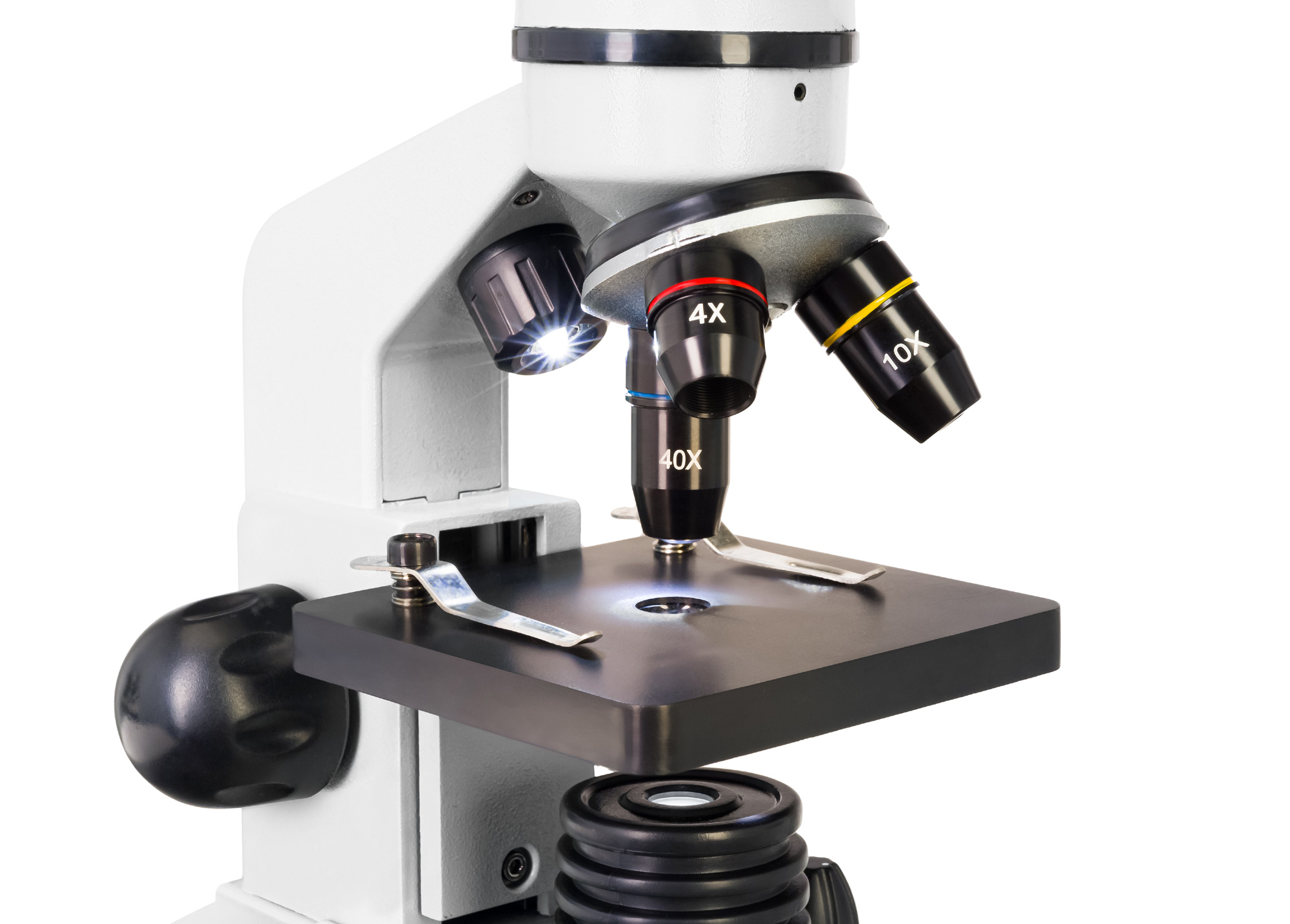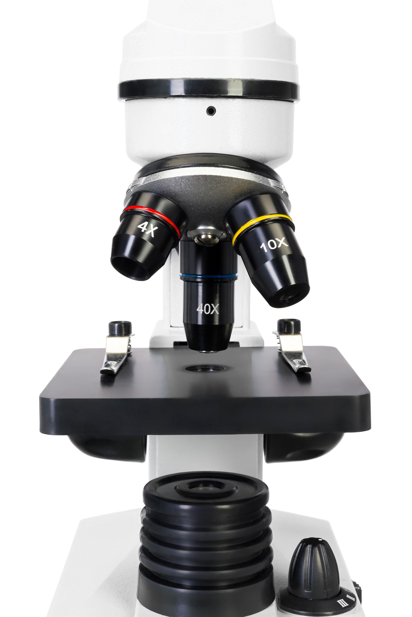 Optika mikroskopu je vyrobená z vysoko transparentného optického skla. Všetky optické plochy sú pokryté viacvrstvovou antireflexnou vrstvou, ktorá zvyšuje priepustnosť svetla a zlepšuje kontrast obrazu. Mikroskop je vybavený tromi objektívmi a ponúka rozsah zväčšenia od 40x do 400x. Zmenu zväčšenia možno vykonať jednoduchým otočením revolverového nosiča objektívov.