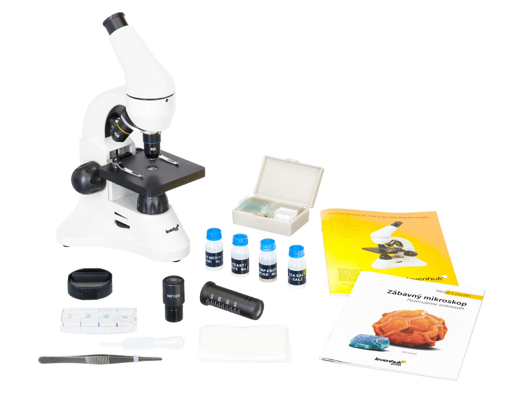 Súčasťou balenia je experimentálna sada Levenhuk K50, ktorá obsahuje pripravené preparáty aj nástroje na vytváranie vlastných vzoriek. Používateľ tak môže okamžite začať objavovať mikroskopický svet a vykonávať jednoduché biologické experimenty.