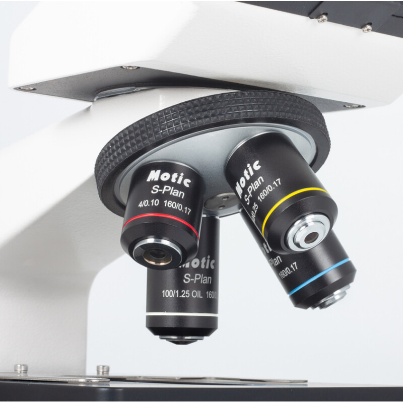 Objektive: 4X/0.10 (AA 17.9mm), 10X/0.25 (AA 5.3mm), 40X/0.65/S (AA 0.61mm), 100X/1.25/S-Öl (AA 0.165mm)