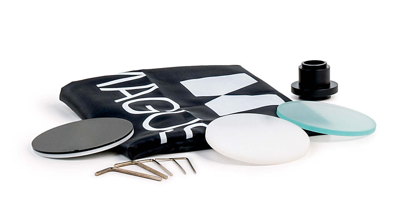 Pracovný stolík je vybavený vymeniteľnými doskami pre optimalizáciu kontrastu a osvetlenia. Súčasťou balenia sú čiernobiela, biela a transparentná doska, ktoré umožňujú prispôsobiť podmienky pozorovania rôznym typom vzoriek.
