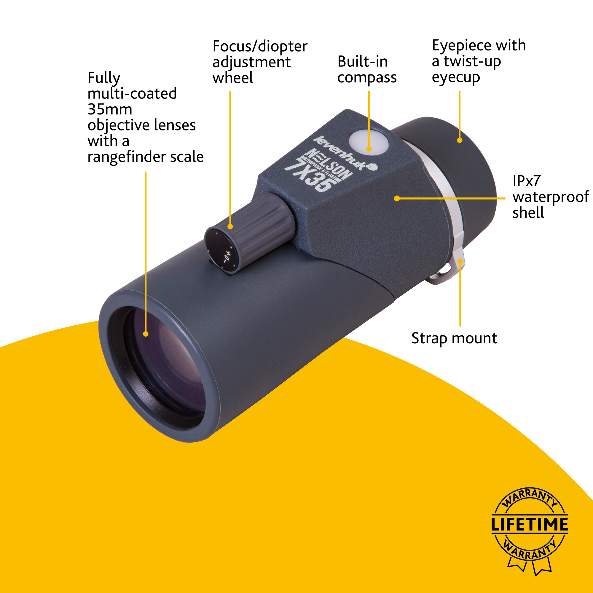 Námorný monokulárny ďalekohľad Levenhuk Nelson 7x35 je užitočný pre rybárov a milovníkov vodných prechádzok. Ľahký a kompaktný prístroj zmestí sa aj do vrecka. Sedemnásobné zväčšenie stačí na detailné zobrazenie vzdialených objektov. Kompaktný optický prístroj poskytuje široké zorné pole - 130 m na vzdialenosti 1000 m. Najbližšia vzdialenosť zaostrenia je len 3 m, čo umožňuje pozorovať blízke pobrežie.