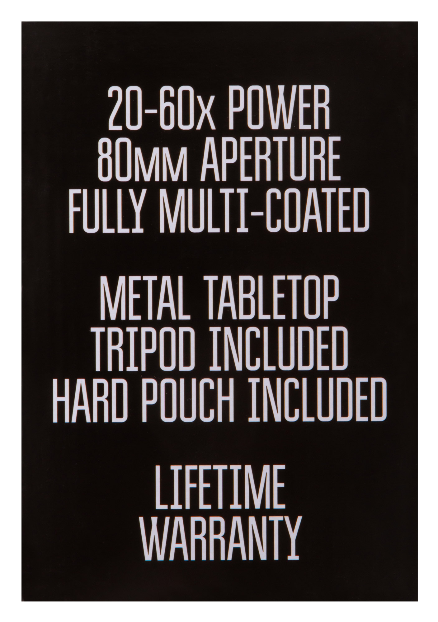 Optika ďalekohľadu je vyrobená zo skla BK-7. Všetky optické povrchy prichádzajúce do styku so vzduchom sú potiahnuté niekoľkými vrstvami antireflexného povlaku. Zväčšenie prístroja je možné plynulo meniť v rozsahu od 20x do 60x. Vďaka veľkému priemeru objektívu pozorovací ďalekohľad zachytáva veľa svetla, prenáša jasný a kontrastný obraz aj v zamračenom počasí alebo za súmraku. Veľká dĺžka výstupnej pupily umožňuje pozorovanie s okuliarmi.