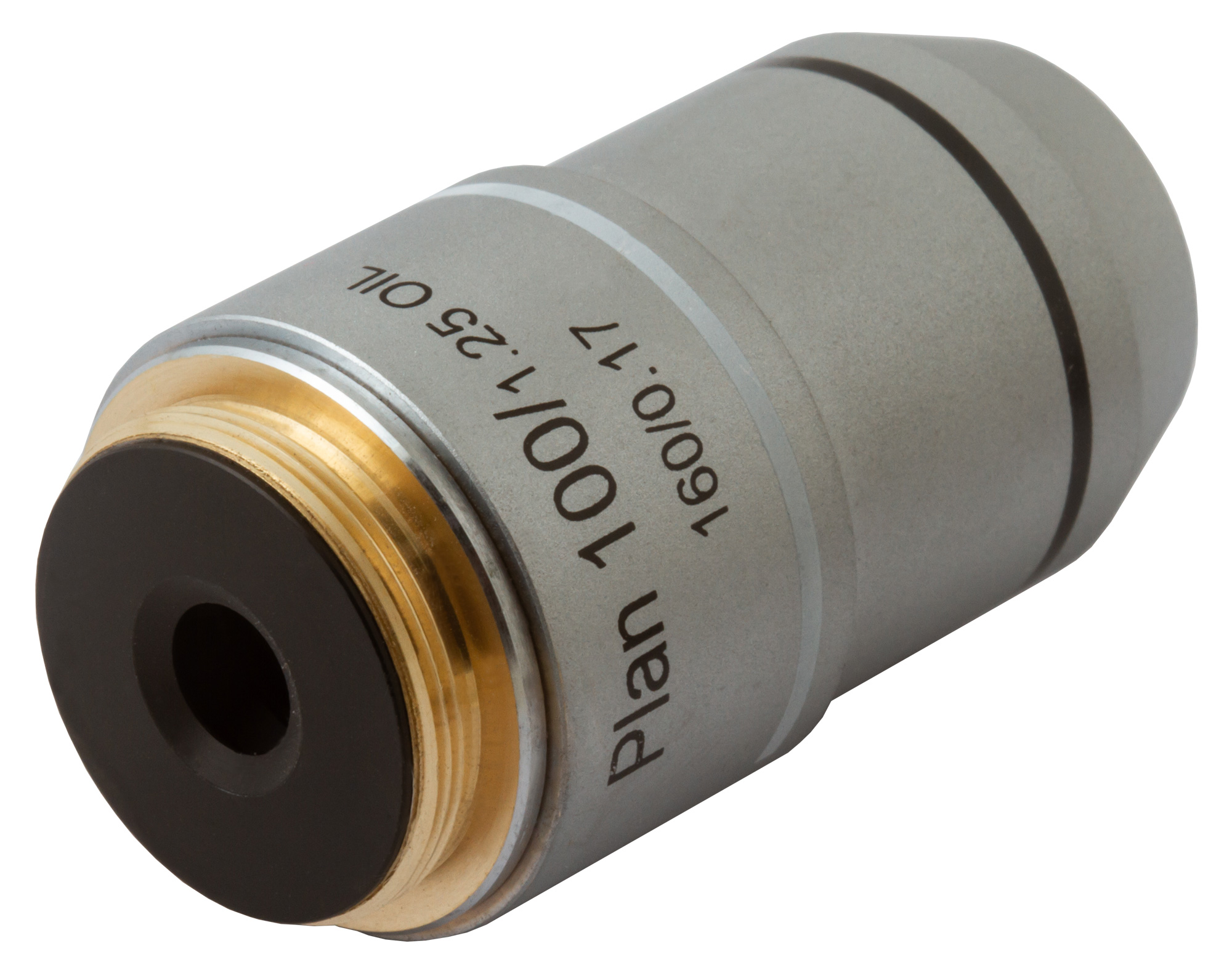 Rovinný achromatický objektiv Levenhuk MED 100x má skleněnou optiku a konstrukci z kovu.