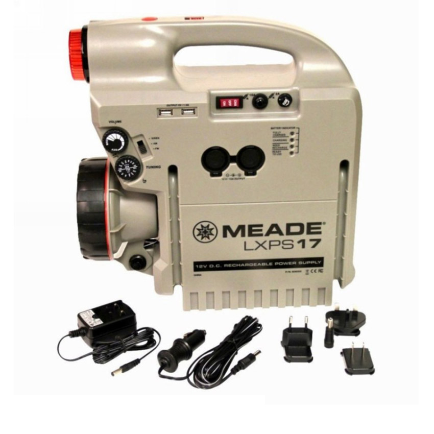 Prenosný nabíjateľný zdroj Meade LXPS 17 ľahko napája váš teleskop a elektronické zariadenia, keď ste v teréne a na pozorovacom maratóne. Pripojte svoje zariadenia pomocou dvoch 12 V portov cigaretového zapaľovača, dvoch USB portov alebo kladných/záporných svoriek na zadnej strane. LXPS 17 obsahuje zabudovaný istič a poistkový obvod na ochranu vášho cenného zariadenia. Vďaka medzinárodným a americkým zástrčkám sieťového adaptéra budete môcť nabíjať LXPS doma aj v zahraničí. Meade LXPS 17 obsahuje aj nastaviteľný superjasný reflektor s 30 LED diódami a vreckovú baterku s bielym svetlom a prídavným červeným filtrom, ktorá je ideálna na nastavovanie a demontáž vášho zariadenia v tme. Okrem toho zdroj LXPS 17 obsahuje rádio AM/FM, sirénu a pripojené odnímateľné svetlo. Zdroj LXPS je ideálny na núdzové situácie, napríklad na naštartovanie batérie vozidla pomocou prepojovacích káblov. So 17 ampérhodinami je zdroj LXPS 17 ideálnym zdrojom na celovečerné pozorovanie hviezd alebo na napájanie viacerých zariadení súčasne.