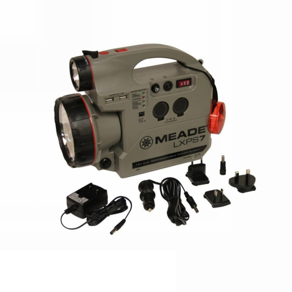 Prenosný nabíjateľný zdroj Meade LXPS 7 jednoducho napája teleskop a elektronické zariadenia, keď ste v teréne. Pripojte svoje zariadenia pomocou dvoch 12 V portov cigaretového zapaľovača, dvoch USB portov alebo kladných/záporných svoriek na zadnej strane. LXPS 7 obsahuje zabudovaný istič a poistkový obvod na ochranu vášho cenného zariadenia. Vďaka medzinárodným a americkým zástrčkám sieťového adaptéra budete môcť nabíjať zariadenie LXPS doma aj v zahraničí. Meade LXPS 7 obsahuje aj nastaviteľný superjasný reflektor s 30 LED diódami a vreckovú baterku s bielym svetlom a prídavným červeným filtrom, ktorá je ideálna na nastavenie a zloženie vašej súpravy v tme. Napájací zdroj LXPS je ideálny na núdzové situácie, napríklad na naštartovanie akumulátora vozidla pomocou prepojovacích káblov. Vďaka 7 ampérhodinám je napájací zdroj LXPS 7 nevyhnutnou súčasťou každého pozorovania.