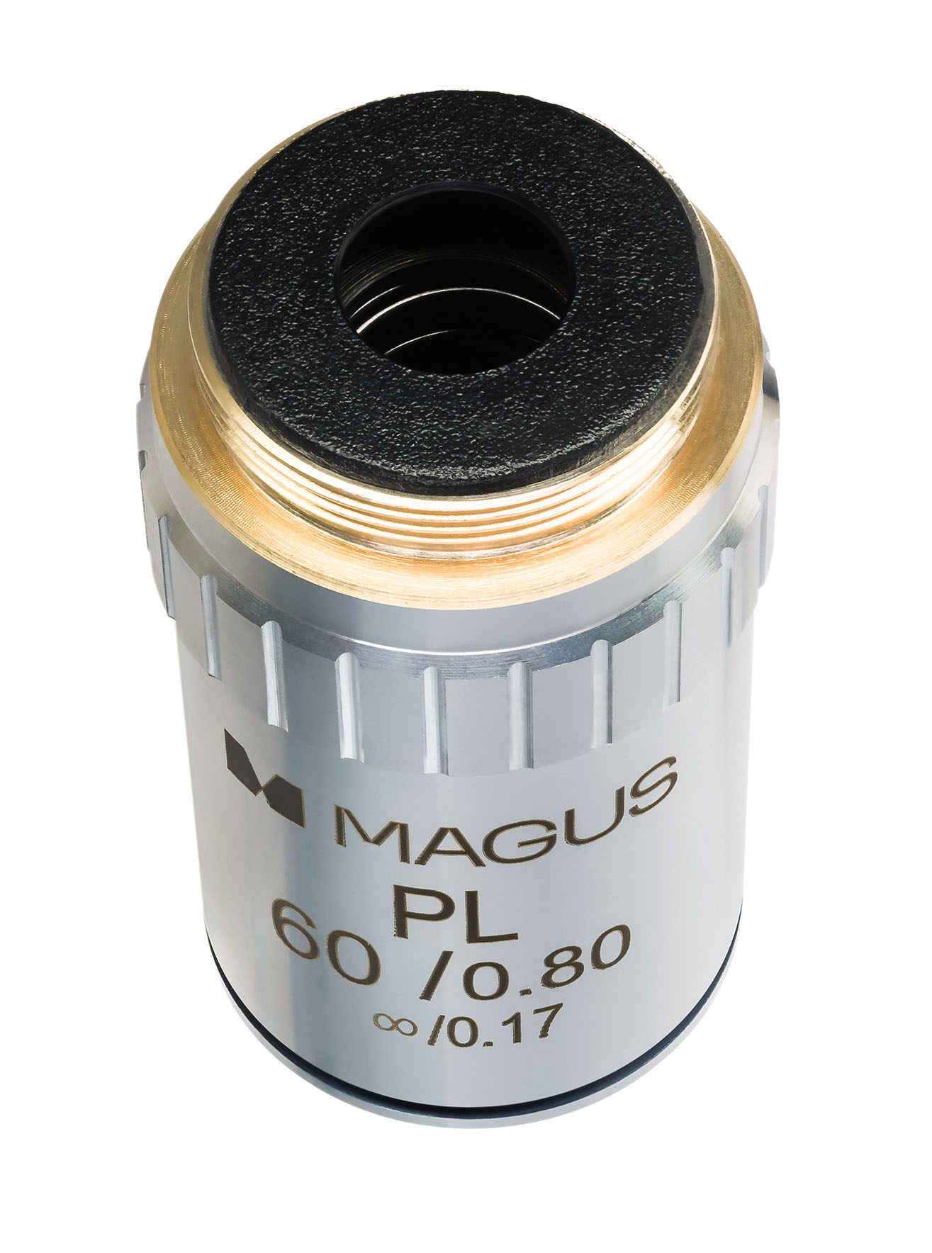 Na pozorovanie s objektívom MAGUS MP60 60x/0,80 ∞/0,17 s korekciou plôšky použite okuláre so zväčšením od 7x do 14x. Pri pozorovaní používajte krycie sklíčko s hrúbkou 0,17 mm. Parfokálny objektív má minimálne skreslenie, je vhodný na digitálnu fotografiu a možno ho používať so širokouhlými okulármi so zorným poľom 22 mm.