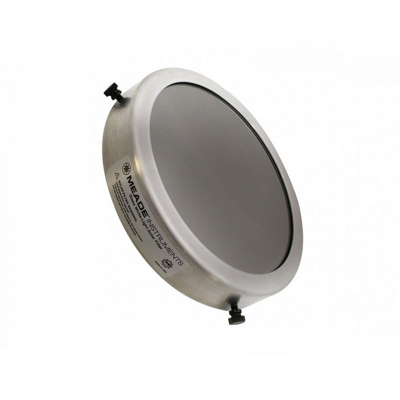 Nové slnečné filtre Meade s bielym svetlom sú dokonalým príslušenstvom na premenu vášho teleskopu na BEZPEČNÝ spôsob pozorovania Slnka! Dostupné v 10 rôznych veľkostiach na pozorovanie a zobrazovanie Slnka v bielom svetle. Naše slnečné filtre s hliníkovým puzdrom a reflexným sklom blokujú 99,999 % dopadajúceho svetla na ochranu a majú certifikát ISO, ktorý zaručuje bezpečnosť pri správnom používaní. Ľahko sa pripevňujú pomocou troch skrutiek (sú súčasťou balenia).