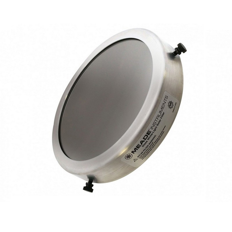 Nové slnečné filtre Meade s bielym svetlom sú dokonalým príslušenstvom na premenu vášho teleskopu na BEZPEČNÝ spôsob pozorovania Slnka! Dostupné v 10 rôznych veľkostiach na pozorovanie a zobrazovanie Slnka v bielom svetle. Naše slnečné filtre s hliníkovým puzdrom a reflexným sklom blokujú 99,999 % dopadajúceho svetla na ochranu a majú certifikát ISO, ktorý zaručuje bezpečnosť pri správnom používaní. Ľahko sa pripevňujú pomocou troch skrutiek (sú súčasťou balenia).