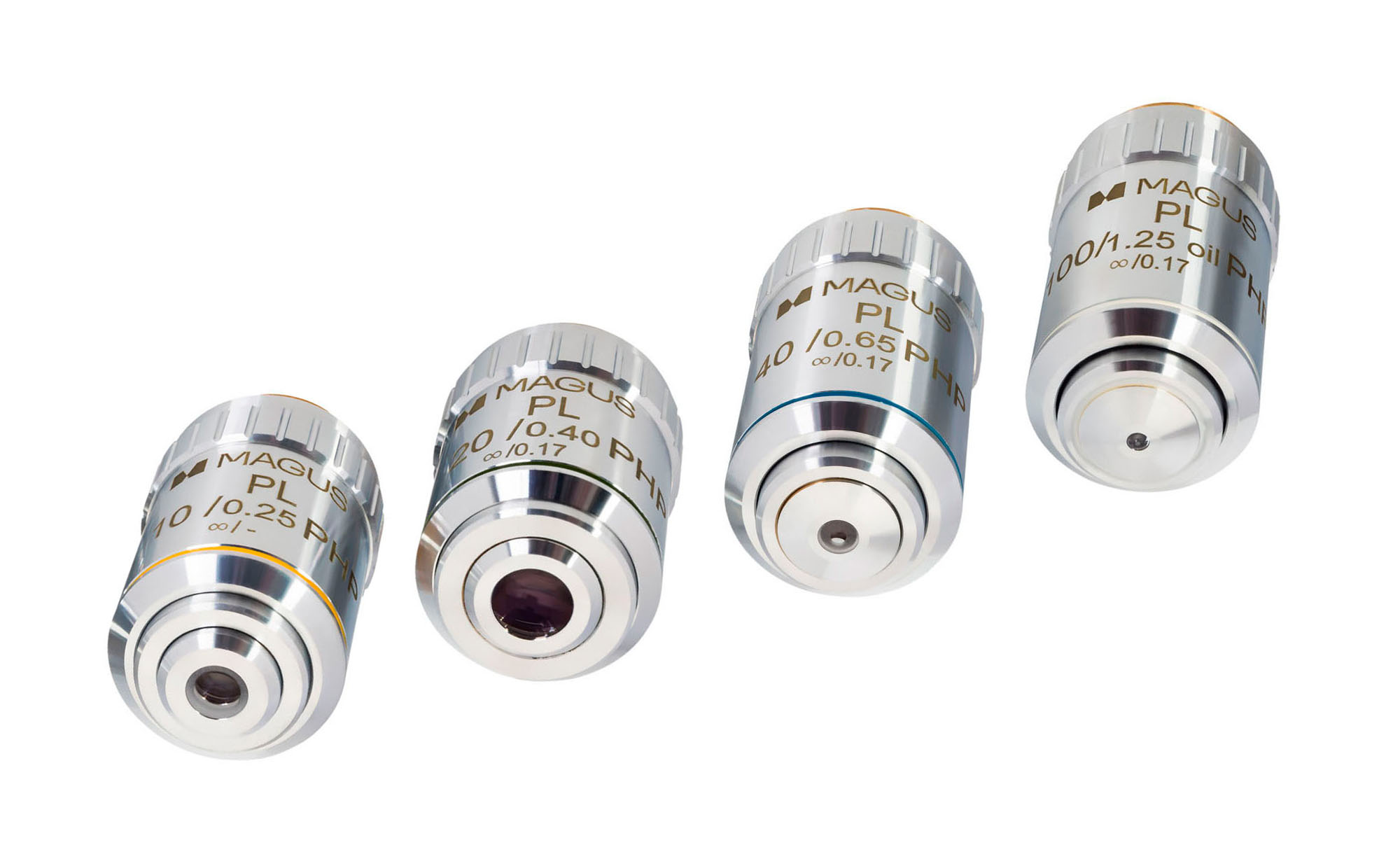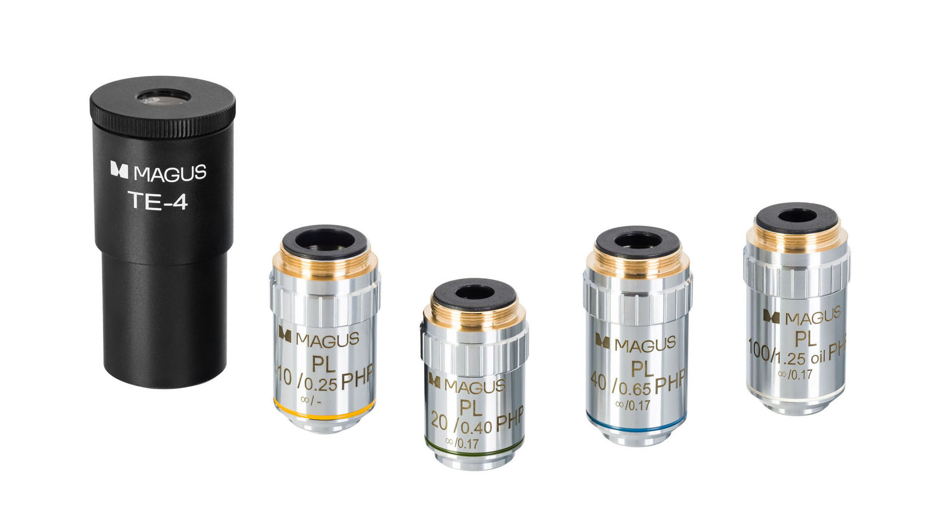 - Planachromatické PHP objektívy — presná optika s korekciou na nekonečno: 10×/0,25; 20×/0,40; 40×/0,65; 100×/1,25 (olej).
