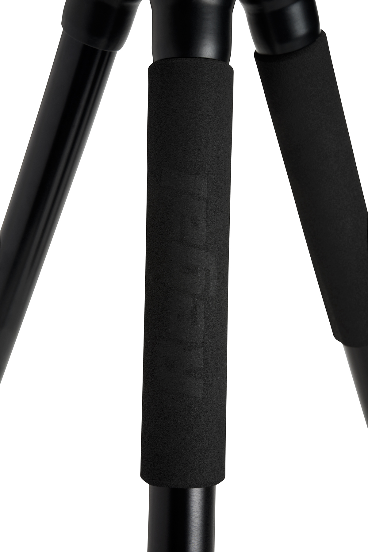 Die Aluminium-Beine des Stativs lassen sich in Höhe und Spreizwinkel vielseitig einstellen. Jedes Bein besteht aus vier Segmenten, die Länge lässt sich komfortabel über Klemmhebel einstellen, sodass das Stativ auch auf unebenem Gelände gerade steht. Jedes Bein kann auch in drei verschiedenen Spreizwinkeln fixiert werden – das ist sehr hilfreich, wenn das Gelände größere Höhenunterschiede hat