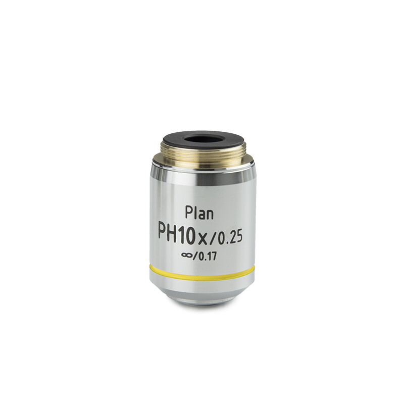 Objektív s fázovým kontrastom PLPHi 10x/0,25 IOS, s korekciou na nekonečno, pracovnou vzdialenosťou 10,2 mm a korekciou na krycie sklo 0,17 mm.