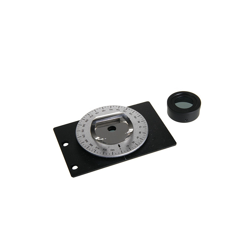 Polarizátor je namontovaný v pripojiteľnom stolíku (100 x 65 mm). Otáčateľný držiak objektov Ø 68 mm, s objektovými svorkami, otočný o 360°, čitateľný v 5°